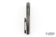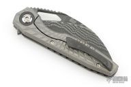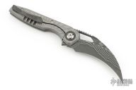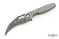 This Ripper by Oden Custom Knives features a Nichols Core Damascus blade with notched thumb rest, thumb hole, and fuller. The handle has a zirc blasted milled titanium frame with zirc pivot collars, CarboTi notched backstrap and matching CarboTi clip with hidden screws. Nice detent, lockup and blade seating, rides on bearings. Comes with original box, and metal COA dated 6/8/25. Has some light scuffs, excellent condition otherwise.