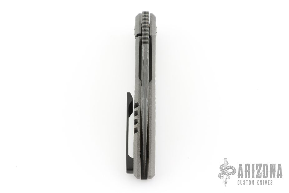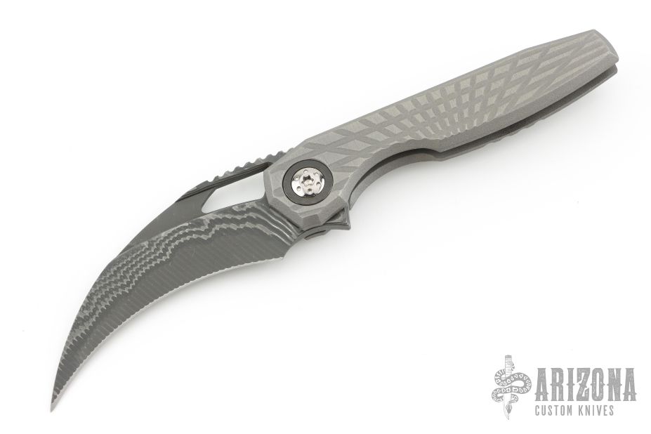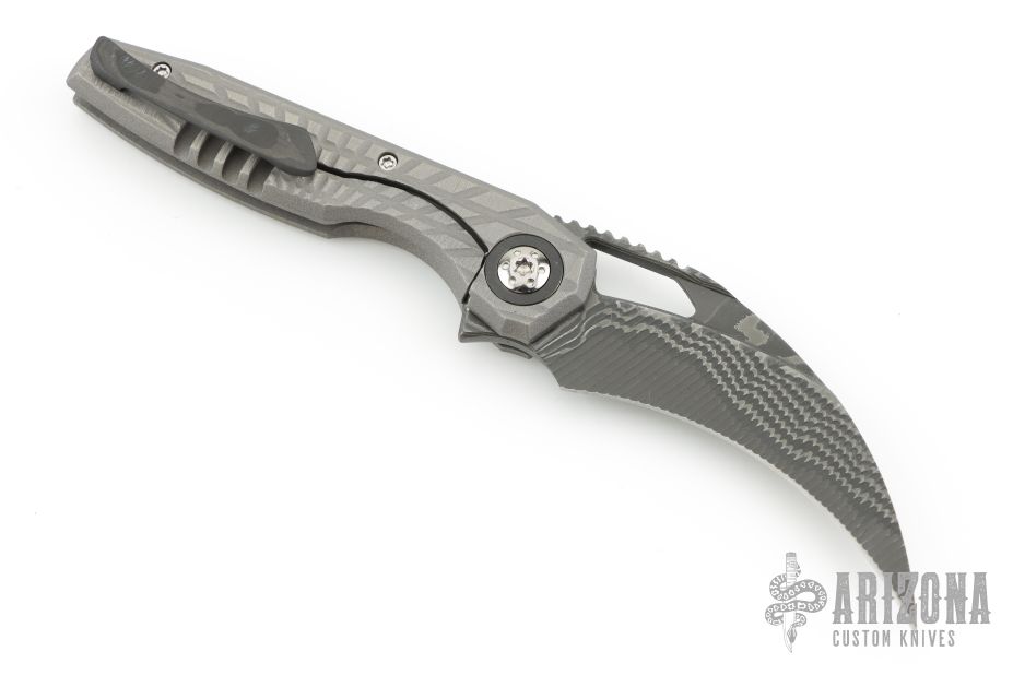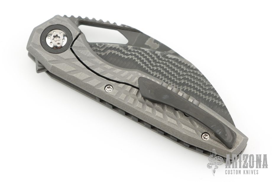 This Ripper by Oden Custom Knives features a Nichols Core Damascus blade with notched thumb rest, thumb hole, and fuller. The handle has a zirc blasted milled titanium frame with zirc pivot collars, CarboTi notched backstrap and matching CarboTi clip with hidden screws. Nice detent, lockup and blade seating, rides on bearings. Comes with original box, and metal COA dated 6/8/25. Has some light scuffs, excellent condition otherwise.