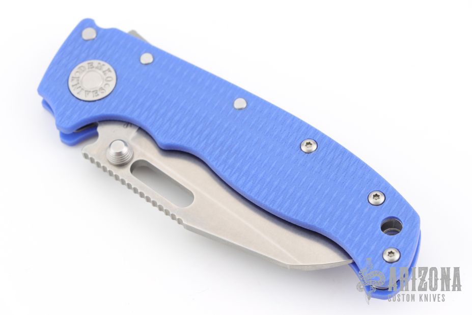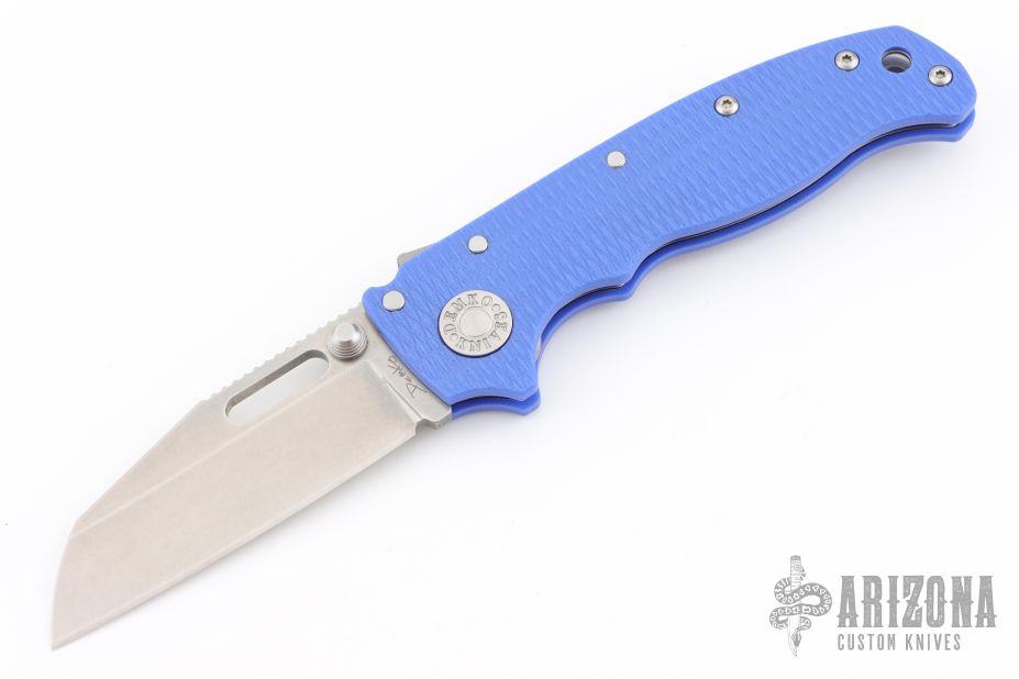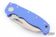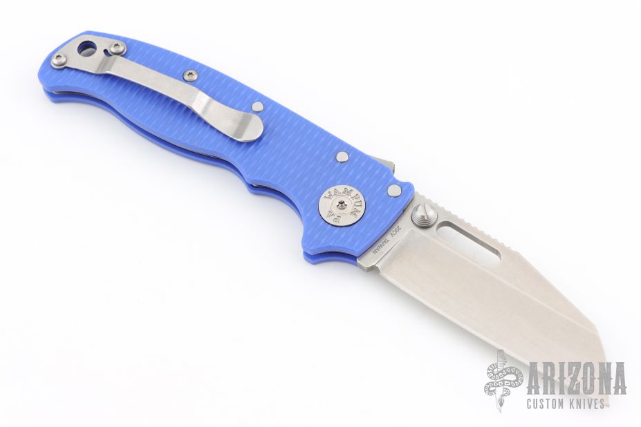 The AD20.5 by Demko Knives features the impressive Shark Lock and an even more impressive price point. The Shark Lock mechanism is situated on the spine of the knife and operated with a ramp-like ‘fin’, allowing you to flip the blade open and closed at will. It's probably the best thing about this knife and design, how quickly it can be deployed and ready for action. It acts as a blade launcher and a little wrist action is all it needs. Comes with original tube and extra clip. Has blue G-10 scales. Has been resharpened, otherwise excellent condition.