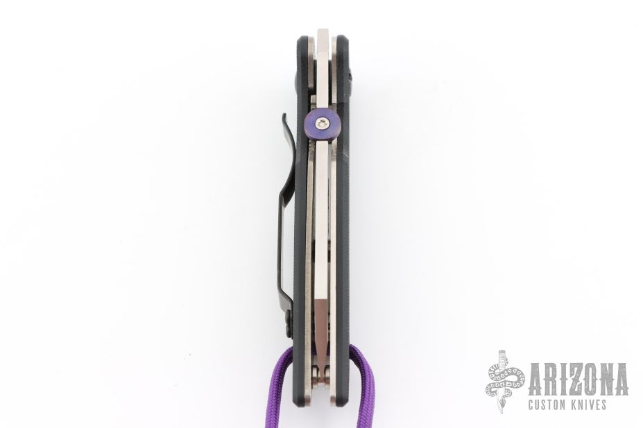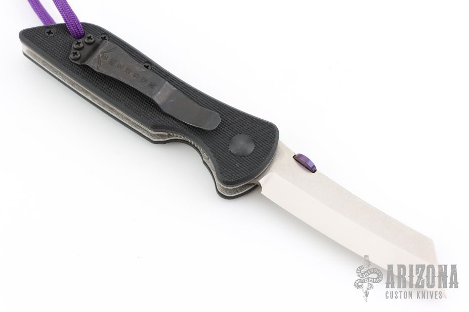 Stonewashed blade, black G-10 scales, titanium liners, black stainless steel clip. Has a custom purple titanium thumbdisc, comes with original thumbdisc as well. Comes with original box and papers. #0366. Excellent condition.