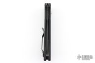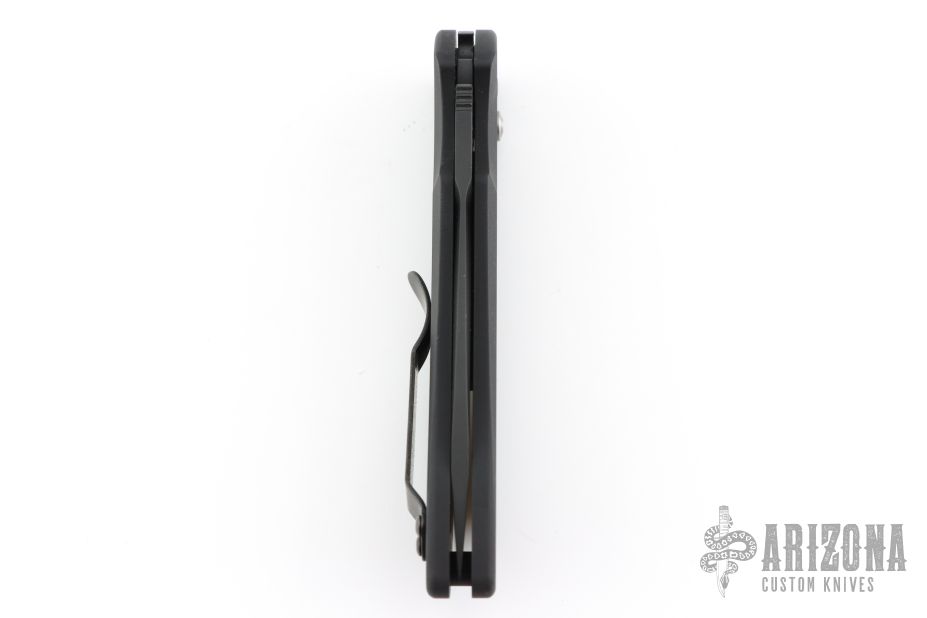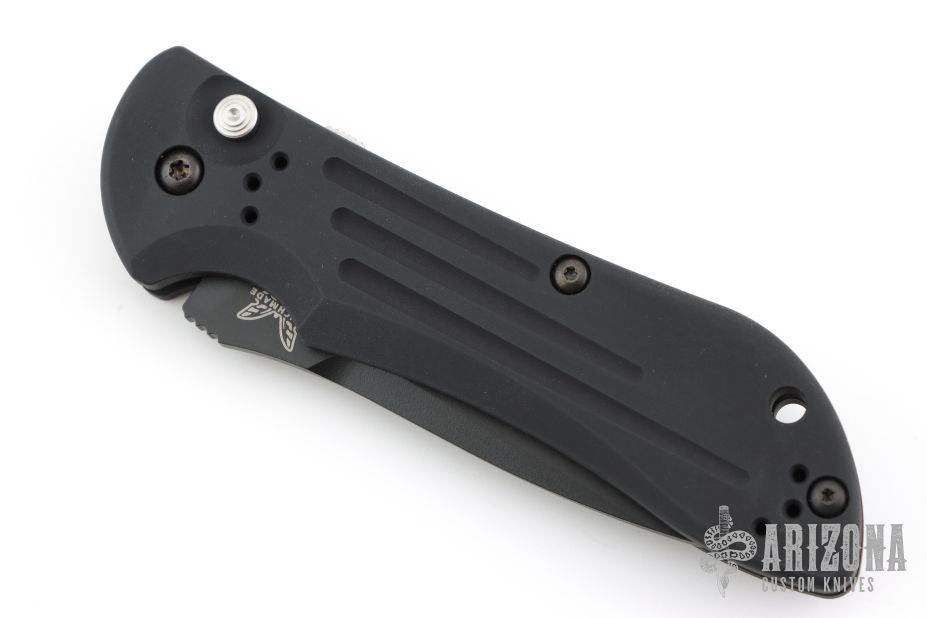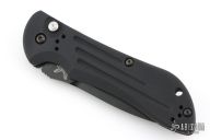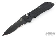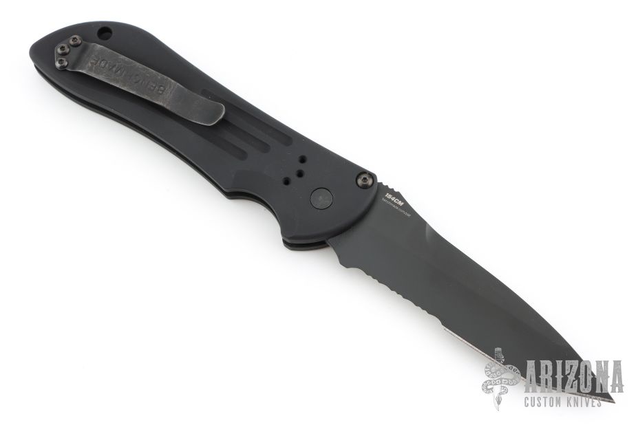 This 9101SBK AUTO Stryker from Benchmade features a black coated drop point tanto style blade with swedge, notched thumb rest and partial serrations. The handle is comprised of milled black aluminum frame with a black coated stainless steel tip up clip. Safety on backspacer and lanyard hole in pommel. Excellent condition. Comes with original box and papers.