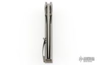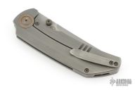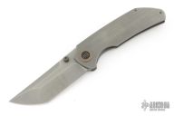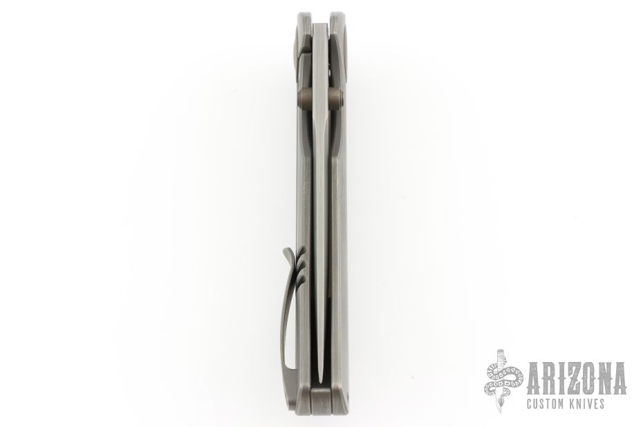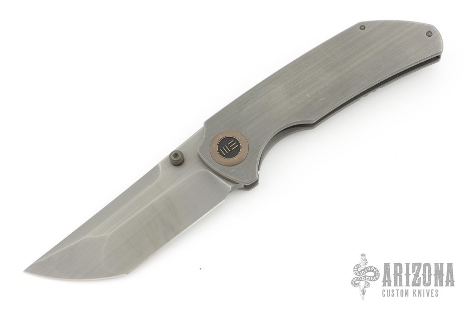 This knife by WE Knife company features a darkened/satin finished tanto style blade with dual thumbstuds.  The handle features a titanium frame with a matching tip up pocket clip and backspacer.  Comes in a Mcnees box. Has some scuffs and scratches, good condition otherwise.