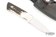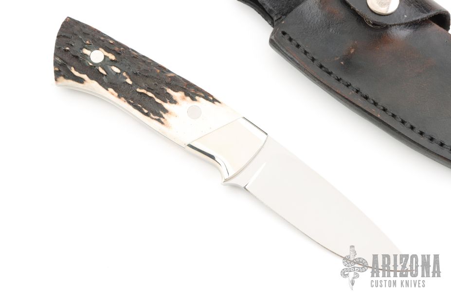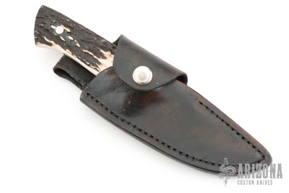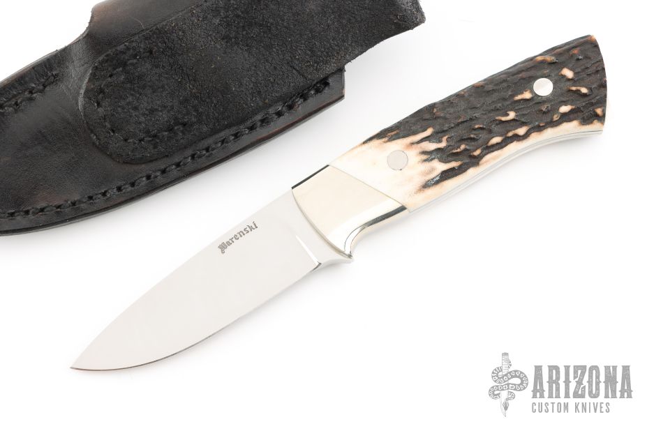 This knife by Buster Warenski features a mirror polished blade with .165" blade stock, 1.075" blade depth, full tapered tang construction. The handle has nickel silver bolsters and stag scales. Comes with a black leather sheath. Has a few very light scratches, otherwise excellent condition.