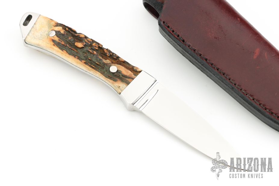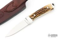 This Integral by Mike Franklin features a mirror finished blade with .190" blade stock and .910" blade depth, full integral tang construction. The handle has integral bolsters, stag scales, lanyard hole in the rare bolster. "OOAK" on the b-side of the blade. Excellent condition. Comes with a maroon leather sheath.