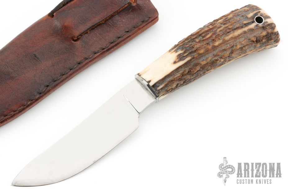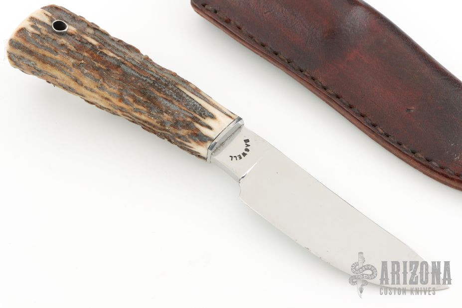 This Skinner by Bill Bagwell is thought to be mid 1970s-1980, it features a drop point mirror polished blade with .195" blade stock and 1.093" blade depth, hidden tang construction. The handle has a stainless steel guard with a stag grip, lanyard hole at the butt. Comes with brown leather sheath. Has some light scratches, otherwise excellent condition.
