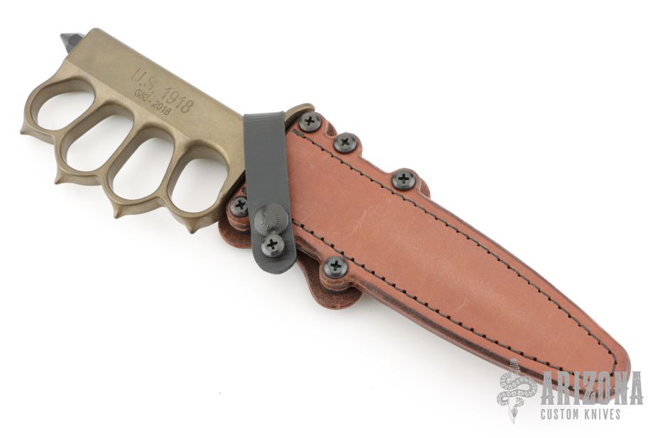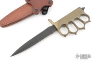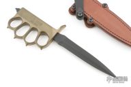 This MK1 Trench Knife by Les George features a black Cerakote double edged blade with .190" blade stock, .998" blade depth, hidden tang construction. The handle has a cast brass knuckle guard grip with a skull crusher. Comes with a brown leather scabbard by Chattanooga Leatherworks. Has a light sheath mark on the blade, otherwise excellent condition.