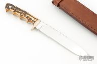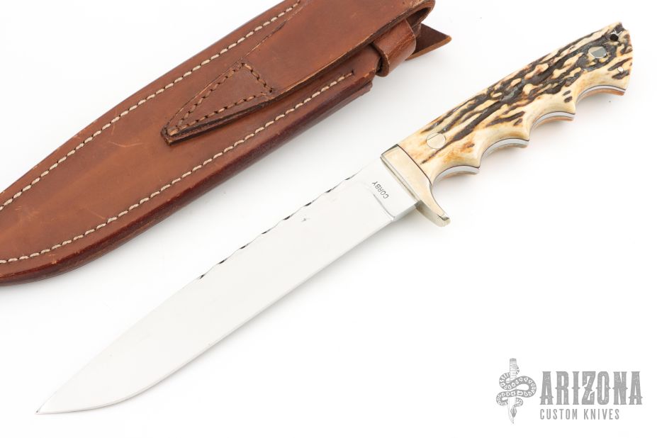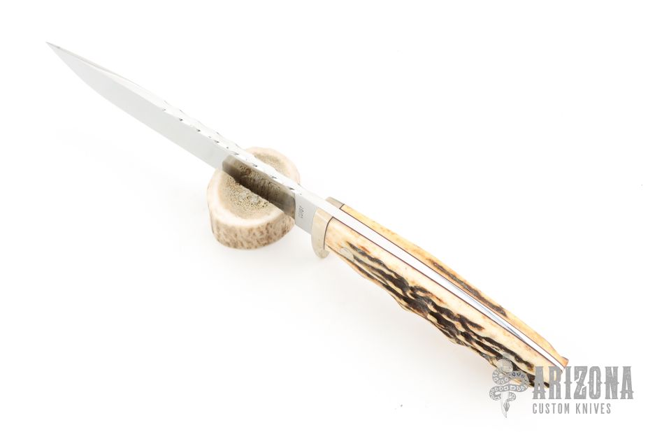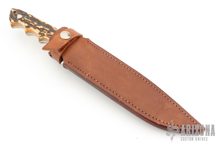 This knife by Harold Corby features a mirror polished blade with fileworked spine, .193" blade stock and 1.120" blade depth, full tapered tang construction. The handle has a nickel silver guard, stag scales with black liners. Comes with a brown leather sheath. Has some light scratches and a small oxidation spot on the blade, otherwise good condition.