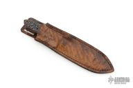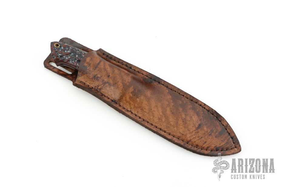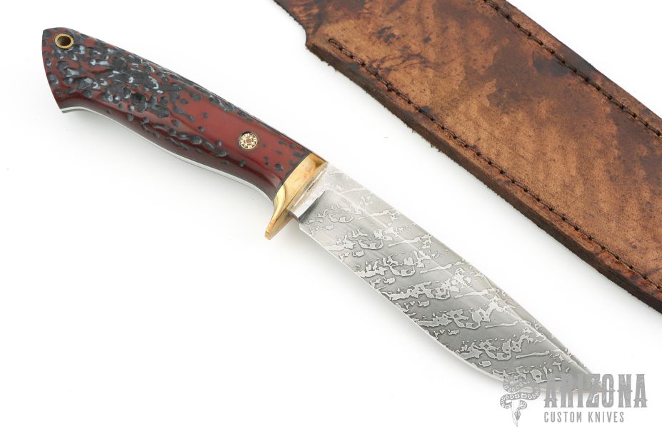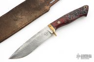 This knife by Night Watch Knives features a two tone acid etch polish finished spear point blade with .193" blade stock and 1.174" blade depth, full tapered tang construction. The handle has a brass guard, and red jigged paper micarta scales with black liners and mosaic pins. Comes with a leather sheath, but it doesn't fit great. Excellent condition.  #003