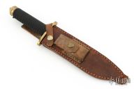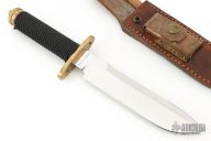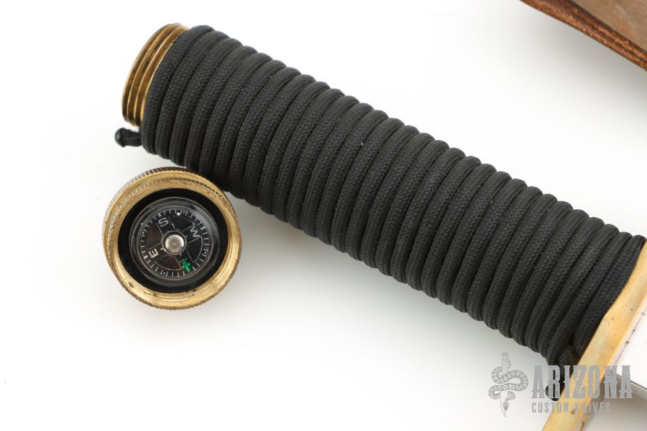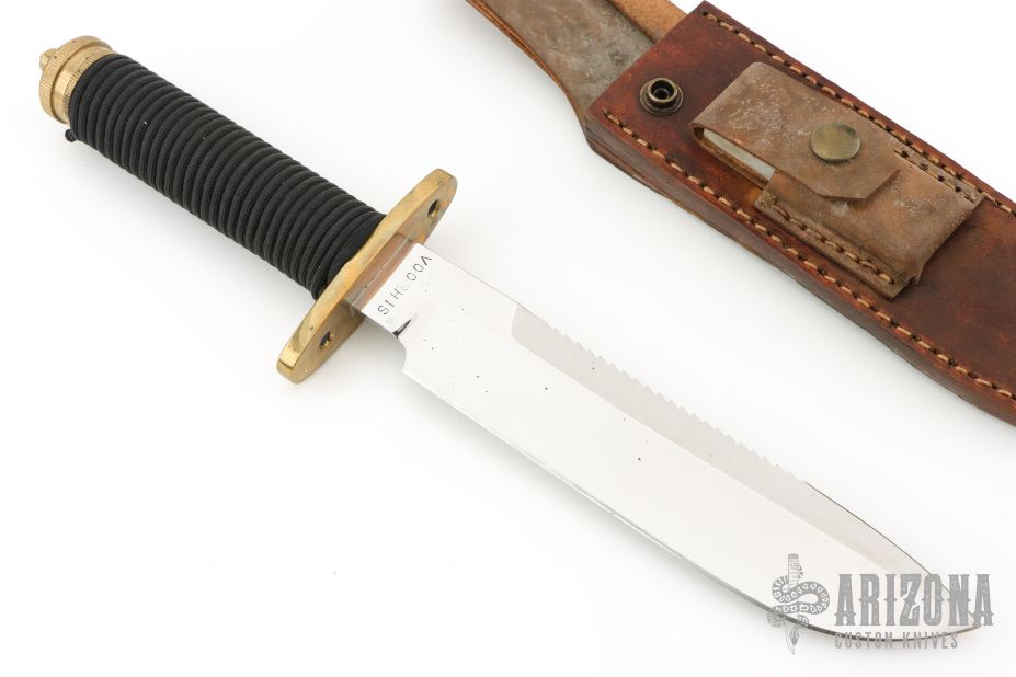 This survival knife by Steve Voorhis features a mirror polished blade with sawteeth and sharpened top edge, .250" blade thickness and 1.508" blade depth. The handle has a brass guard, hollow cord wrapped handle, brass butt cap unscrews and has a compass. Comes with a brown leather sheath. Great feel in the hand. Has a couple small oxidation spots, otherwise excellent condition.