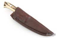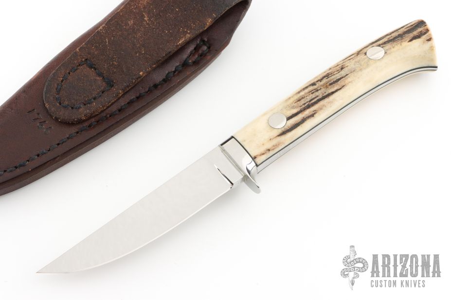 This Model 7 Hunter by the late George Herron features a mirror polished blade with .183" blade stock, .792" blade depth, full tapered tang construction. The handle has a stainless steel guard, stag scales with black liners. Numbered 1766 on tang and brown leather sheath. Comse with a zippered case. Excellent condition.