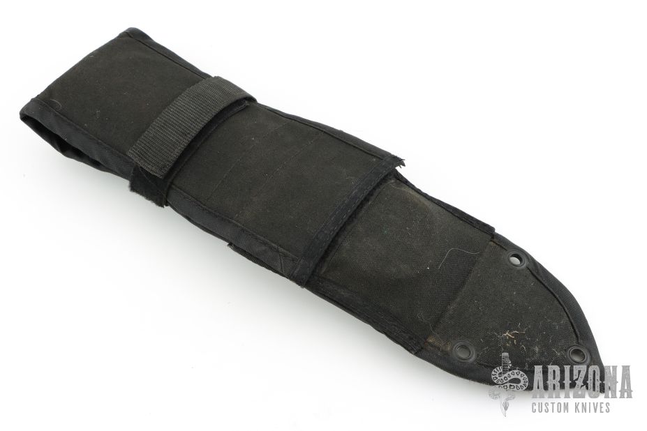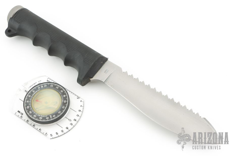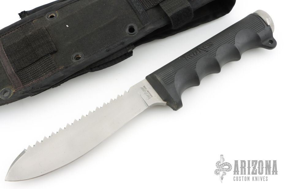 This Survival Knife by Kershaw features a bead blasted blade with sawteeth on the spine, .235" blade stock and 1.435" blade depth, hidden tang construction. The handle has a rubber grip with hollow handle with stainless steel removable butt cap. Comes with nylon sheath that also holds a compass. Has some light scuffs and spots, otherwise excellent condition. Discontinued in 1988.