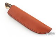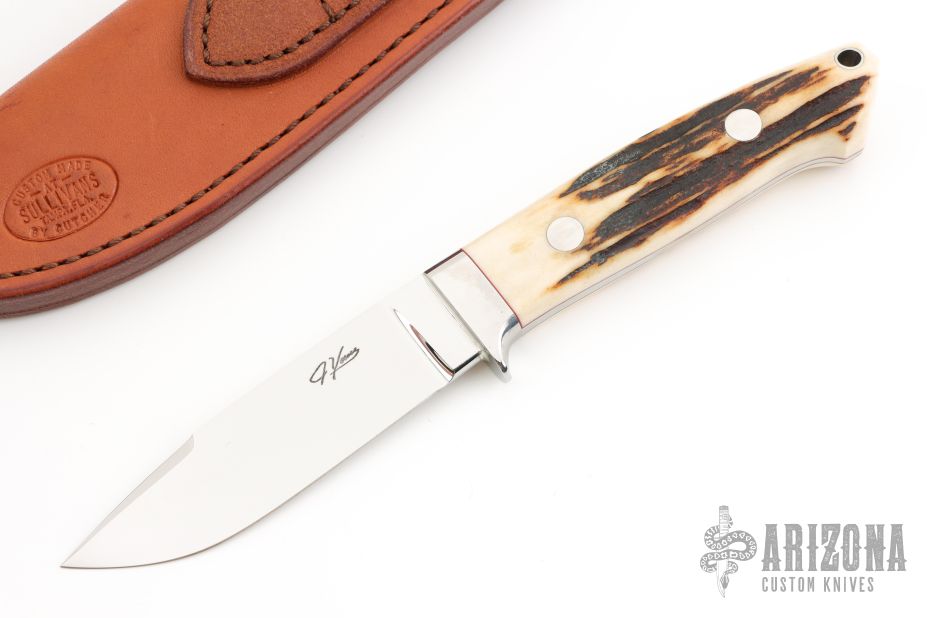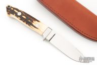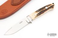 This Drop Point Hunter by John Young features a mirror polished blade with .204" blade stock and .950" blade depth, full tapered tang construction. The handle has a mirror polished stainless guard, stag scales and red liners. Lanyard hole at butt. Comes with brown leather sheath. Excellent condition.