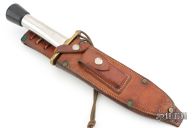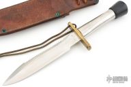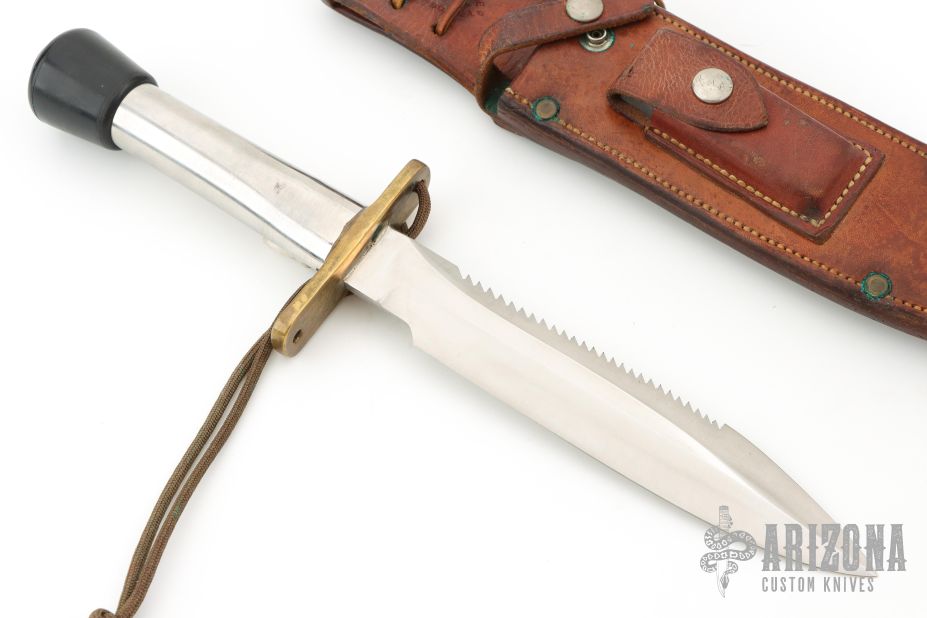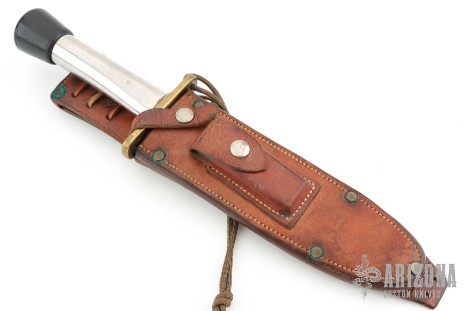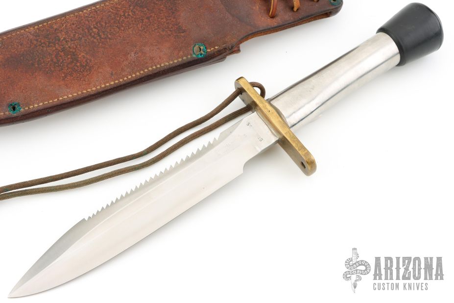 This Solingen Randall Model 18-7.5 Crutch Tip by Randall Made has a Stainless Steel blade with sharpened top edge and sawteeth, .204" blade stock and 1.339" blade depth, hidden tang construction. The handle has a brass guard, and stainless steel hollow handle, this knife has the original "Crutch Tip", there is no threaded butt cap, just a crutch tip covering the hollow handle. Comes with original split back riveted brown leather sheath and stone. Has some scratches and patina, otherwise excellent condition for its age. This one has the "Randall Made Solingen S" stamp, and "STAINLESS" on the ricasso.