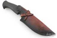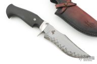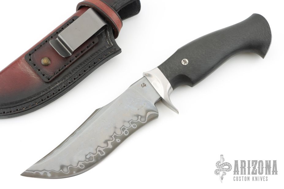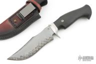 This knife by Dark Timber Knives and the Sobral Brothers features a Sobral San Mai Damascus clip point recurve blade with a false top edge, .216" blade stock and 1.593" blade depth, hidden tang construction. The handle has a pinched stainless steel guard, carbon fiber grip with single pin. Very nice work. Comes with a brown leather sheath with belt clip and a leather zippered case. Excellent condition otherwise.