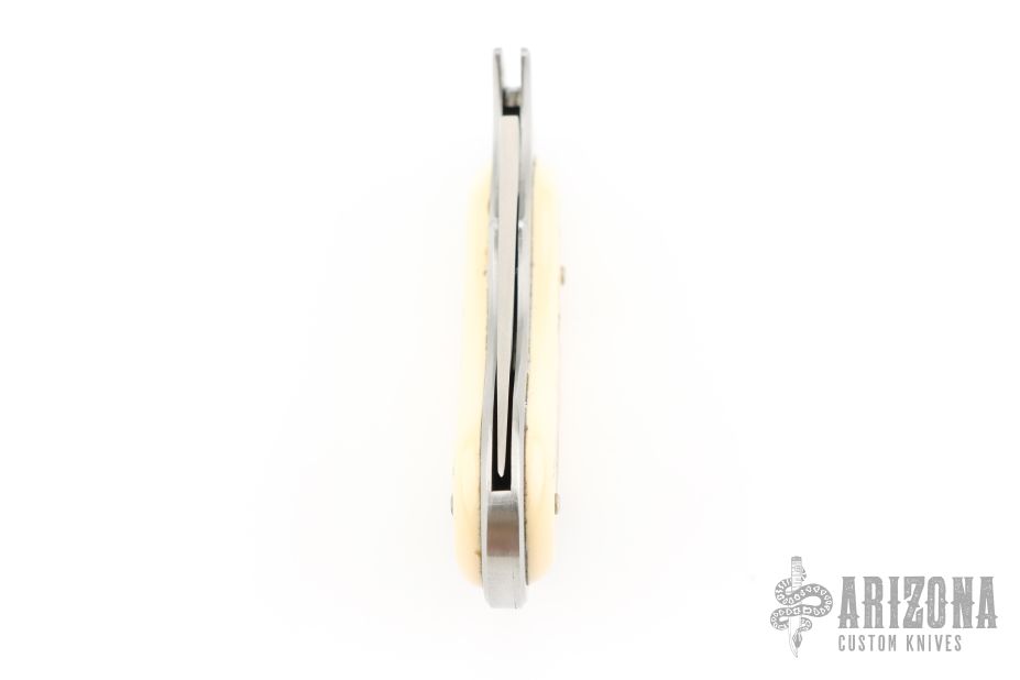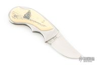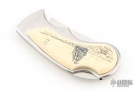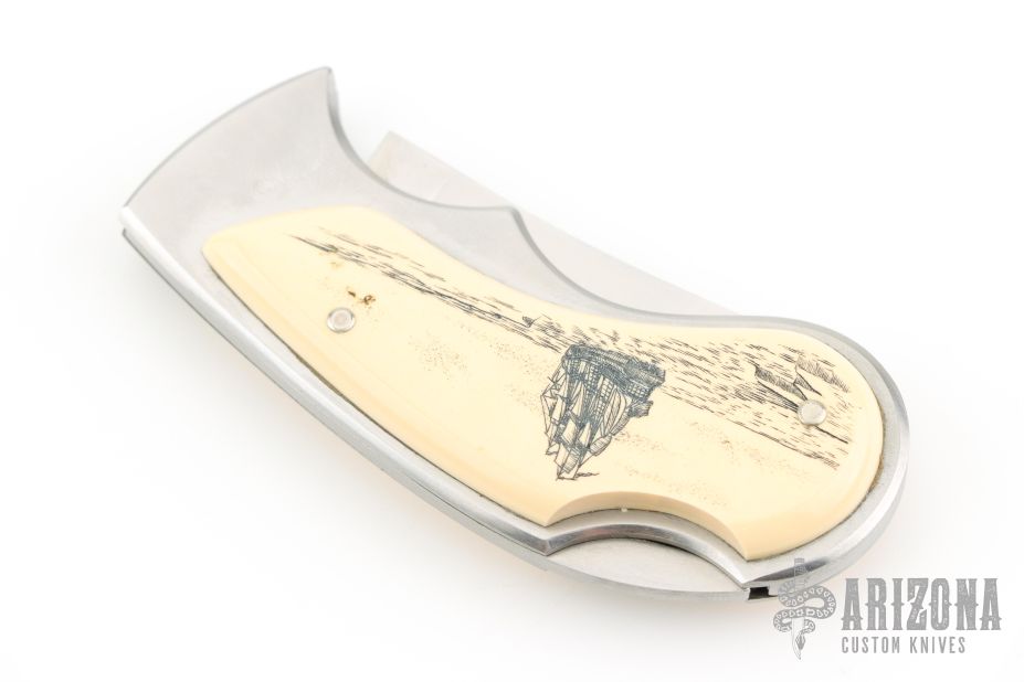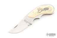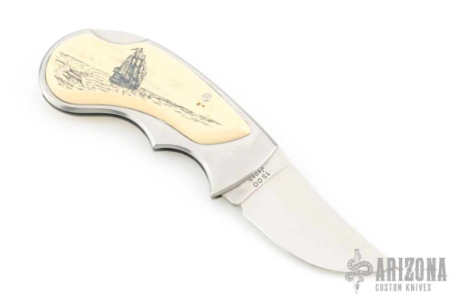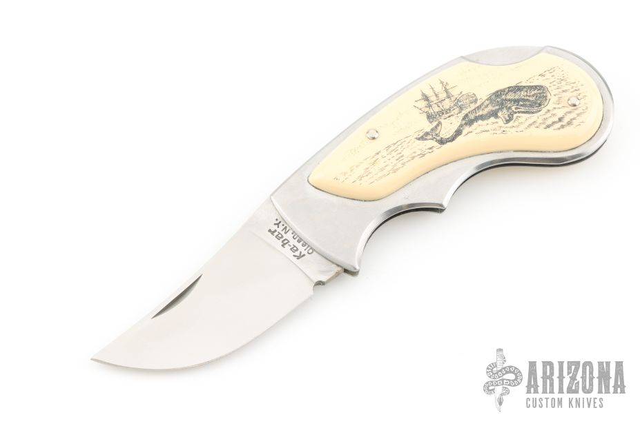 Vintage Ka-Bar folding knife featuring a stainless steel drop point blade, synthetic handle with scrimshaw design, and secure lockback mechanism. Made in Japan, this original piece is both collectible and practical.  Includes the original box and papers.  The box has some damage.  The knife is in Excellent Condition.