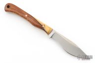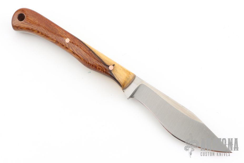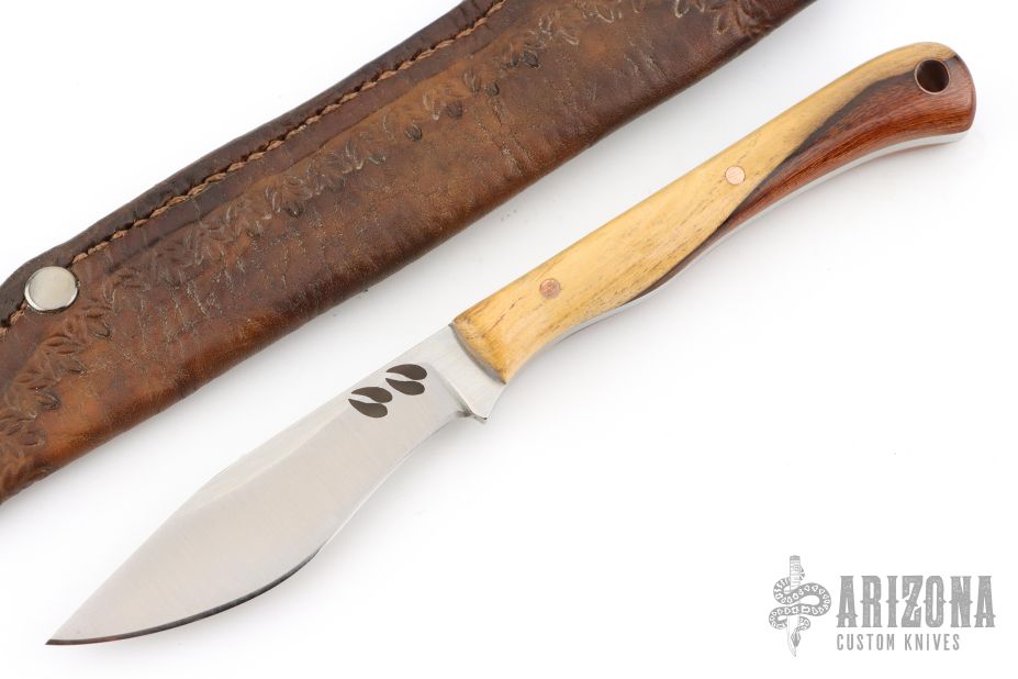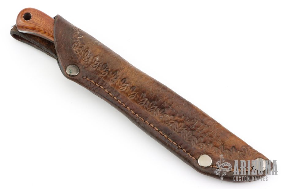 This knife (please let us know if you know who this maker is) features a satin finished blade with .134" blade stock and .806" blade depth, full tang construction. the handle has two-tone desert ironwood scales and a lanyard hole. Comes with a hand tooled brown leather sheath. Excellent condition.