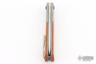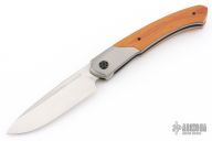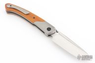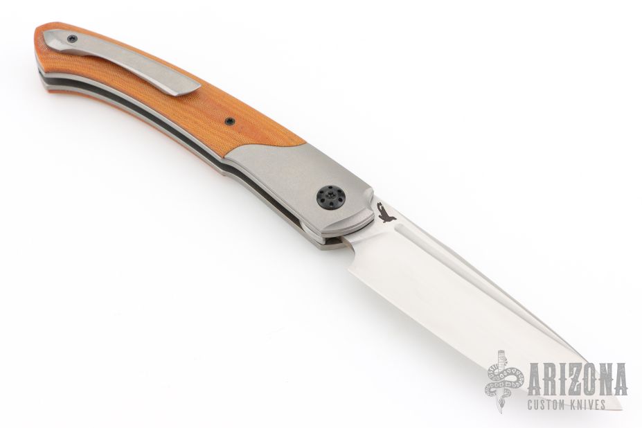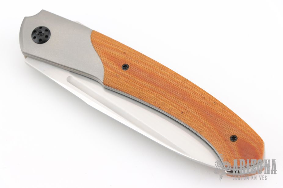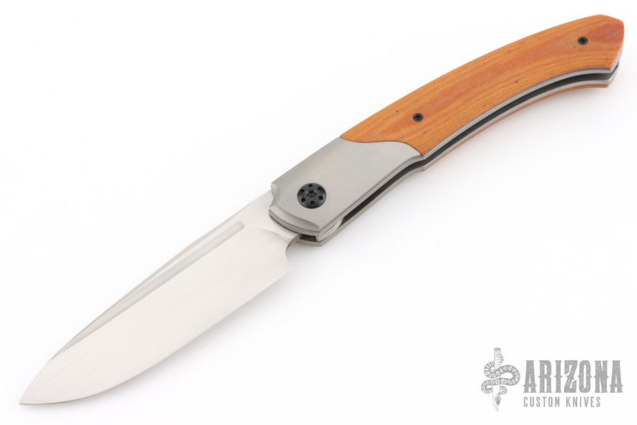 This piece by Olivier Lamy features a satin-finished drop point blade with fuller, orange peel finished titanium bolsters, matching liners, and a tip-up pocket clip. Fitted with Micarta scales. Steel backspacer.  Comes with padded zippered case and COA.  New from maker!