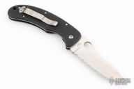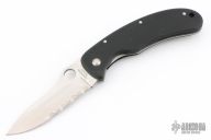 The Tim Wegner C48S by Spyderco is a very collectable Spyderco knife that has been discontinued and is designed to be a hunter with its large hunter trailing point blade. Tim Wegner ended up producing this knife with Blade Tech. Partially serrated and satin finished blade, ATS34. Textured black G10 handle. Stainless tip up carry clip and liner. Has a nice detent, lockup and blade seating. Comes with original box. New condition. Box is a little rough though.