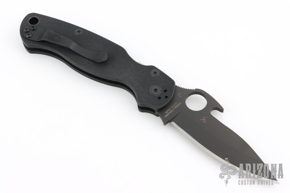 This Paramilitary 2 Linerlock Folder from Spyderco has a black finished clip point blade with thumbhole, Emerson's Wave Feature and notched thumbrest. Handle is black G-10 with stainless steel liners and stainless steel 4-way reversible clip. Comes with original box and papers. New condition.