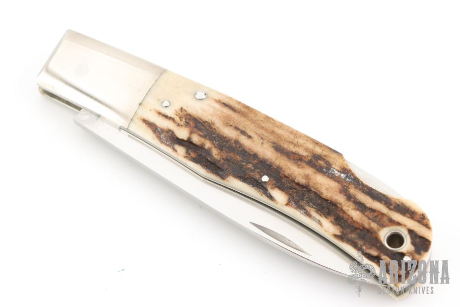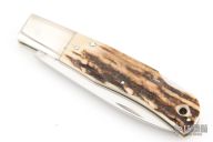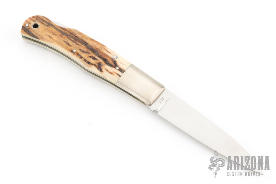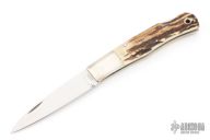 This BHL (Big Horn Lock) lockback folder by Jess Horn features a hand-rubbed satin finish blade with nail nick. The handle has satin nickel silver bolsters, stag scales, nickel silver liners, and a stainless steel spring. Opens and closes with a nice snap. Excellent fit and finish. #227 on the blade. Excellent condition.
