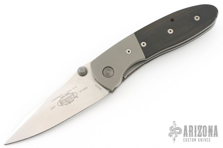 This Lightfoot LCC D/A side opener by Microtech has a stonewashed blade, bead blast finished aluminum bolsters, and micarta scales. Stainless steel clip and liners. Dated 12/2000 and #2427. Comes in a period-correct microtech nylon belt sheath. Has scuffs, scratches and patina. Good condition for its age; and otherwise.