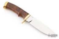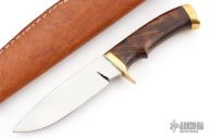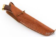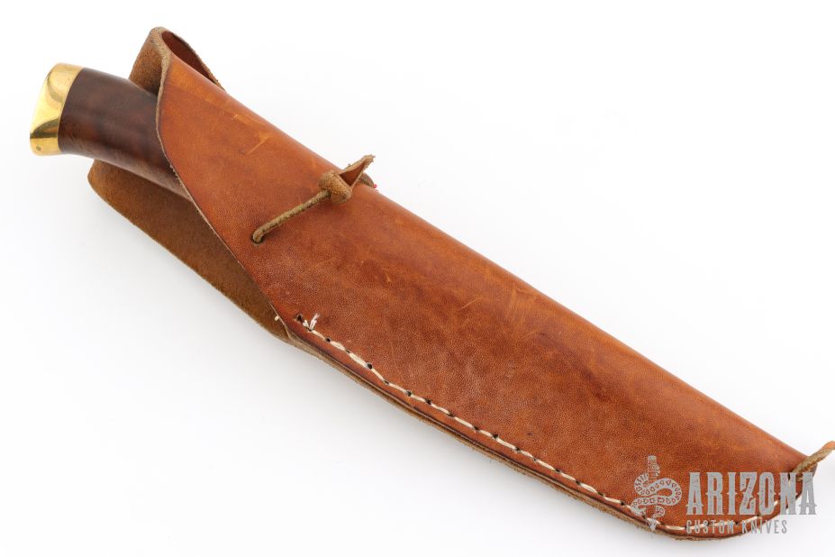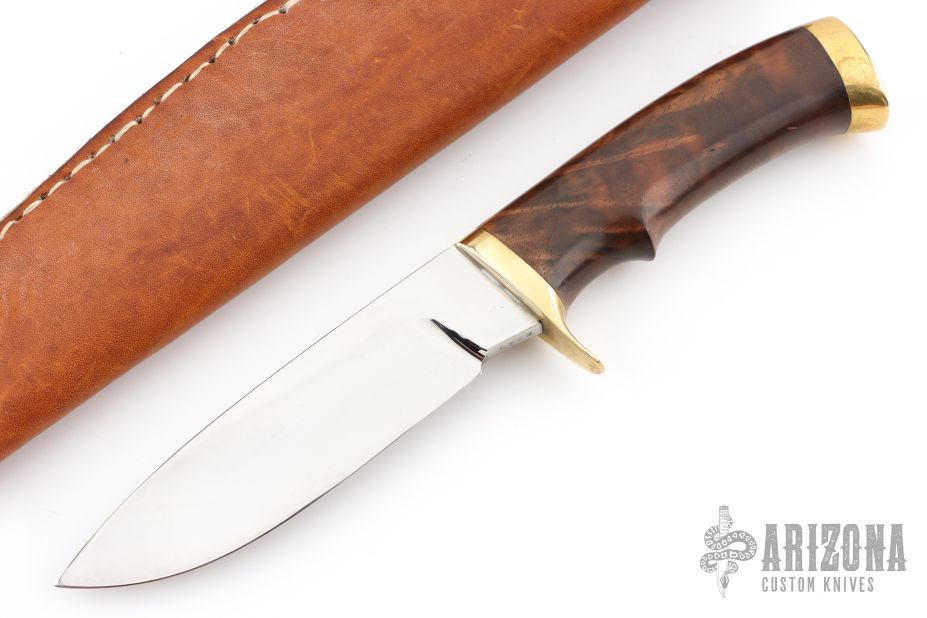 This knife by George Herron features a mirror polished blade with .260" blade stock and 1.234" blade depth, hidden tang construction. The handle has a brass guard and butt with a walnut grip. Comes with a brown leather sheath, but it is not original. #6225 under the ricasso. Has some very light staining on the blade, otherwise excellent condition.