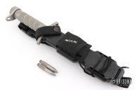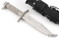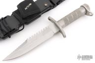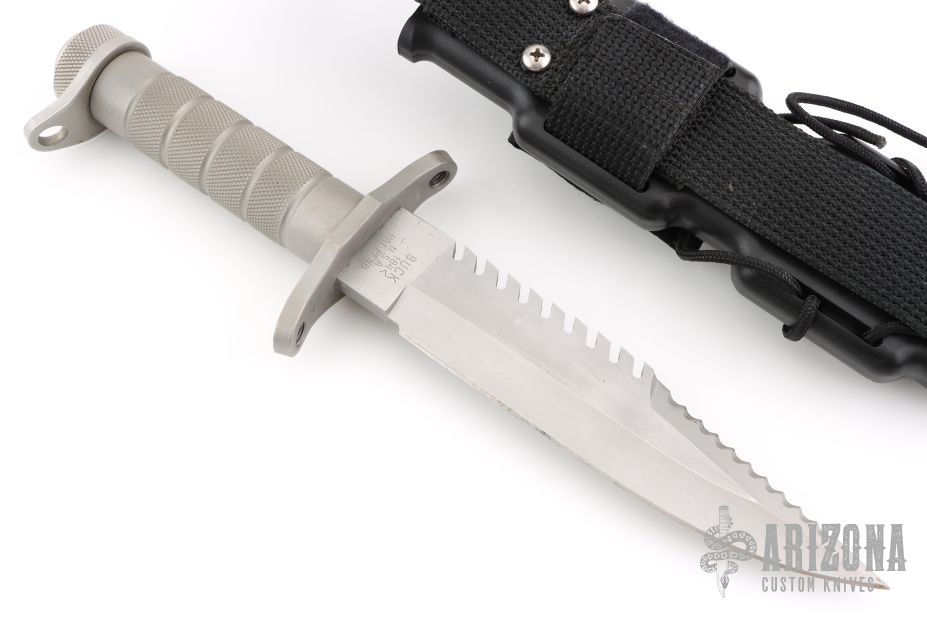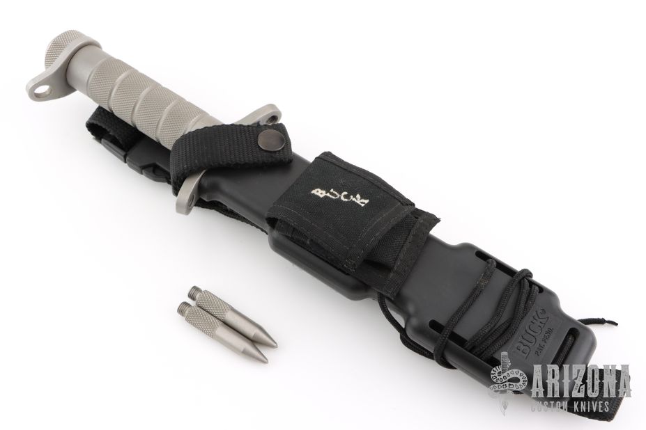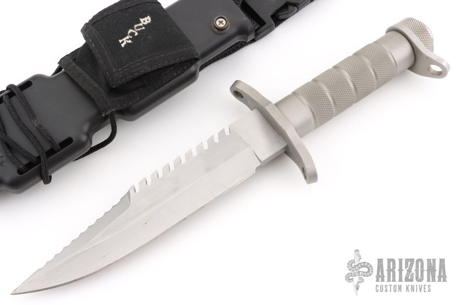 This Buckmaster 184 from Buck Knives has a bead blast blade with a sharpened and serrated top edge, has sawteeth on spine, .288" blade stock and 1.457" blade depth, hidden tang construction and a hollow knurled handle. Includes original sheath, compass and removable grappling hooks. Has some scratches and scuffs, otherwise good condition.