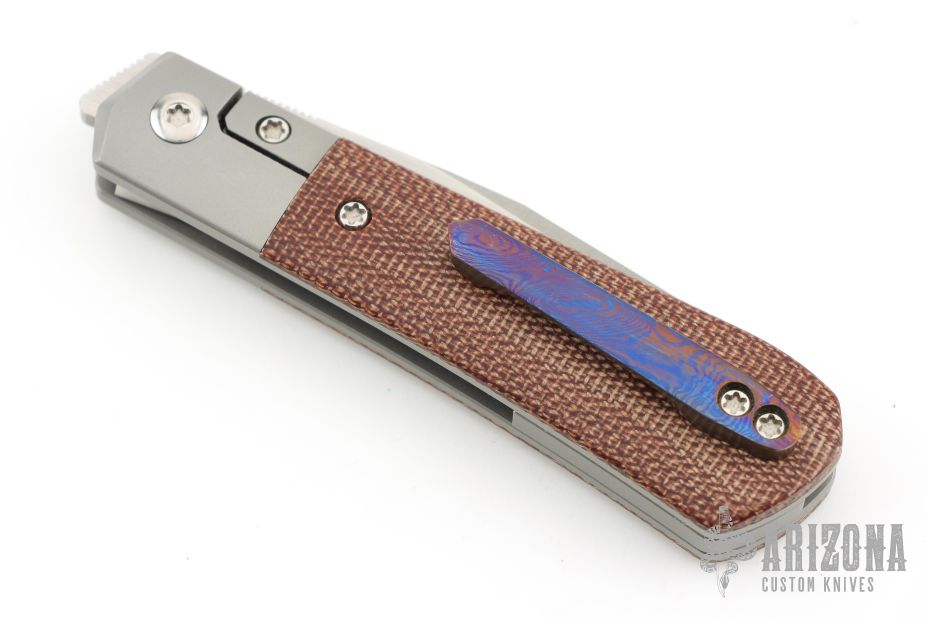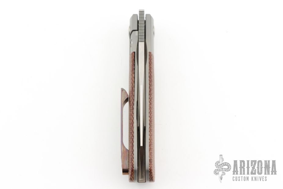 This Apache Front Flipper by Enrique Pena features a satin finished blade with a front flipper and notched thumbrest. The handle has titanium bolsters, green micarta scales with a titanium backspacer and mokuti tip up pocket clip. Comes with a Bill's case. Has some light scratches, great condition otherwise.