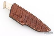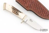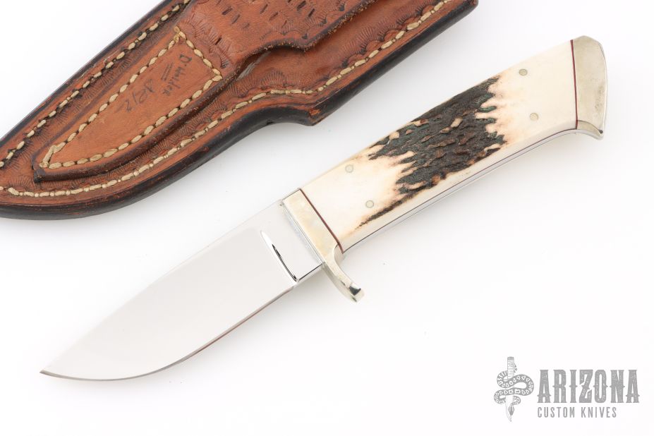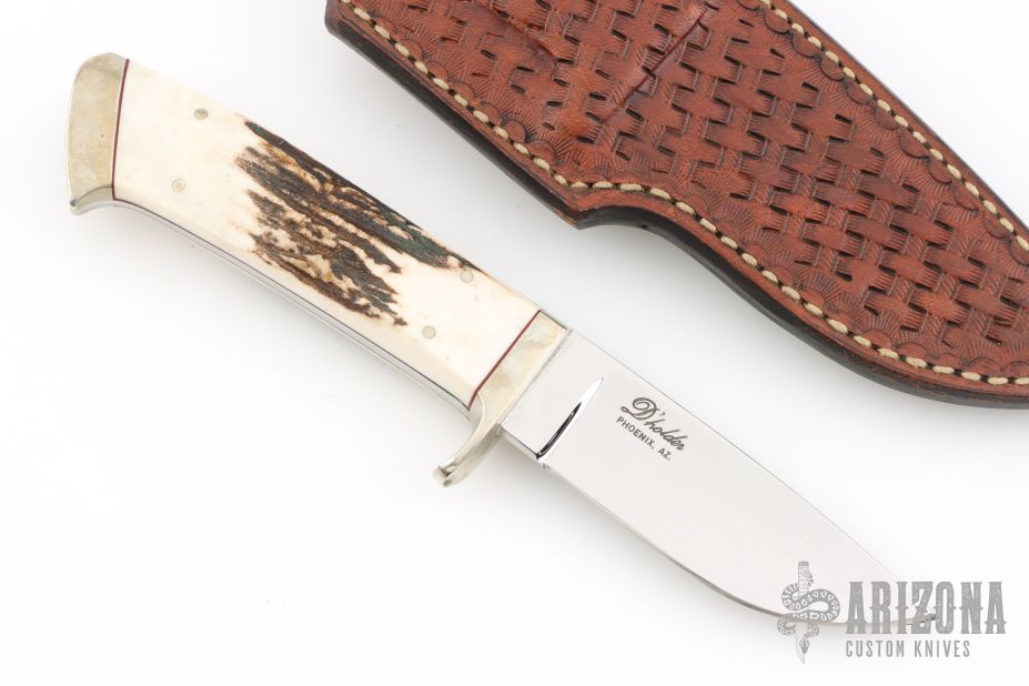 This knife by D'Alton Holder features a mirror polished blade with .189" blade stock and 1.037" blade depth, full tapered tang construction. The handle has a nickel silver guard and butt, stag scales with thin red liners. Comes with a hand tooled brown leather sheath. Has a couple light scratches, otherwise excellent condition.