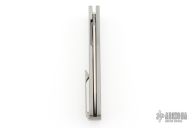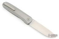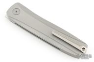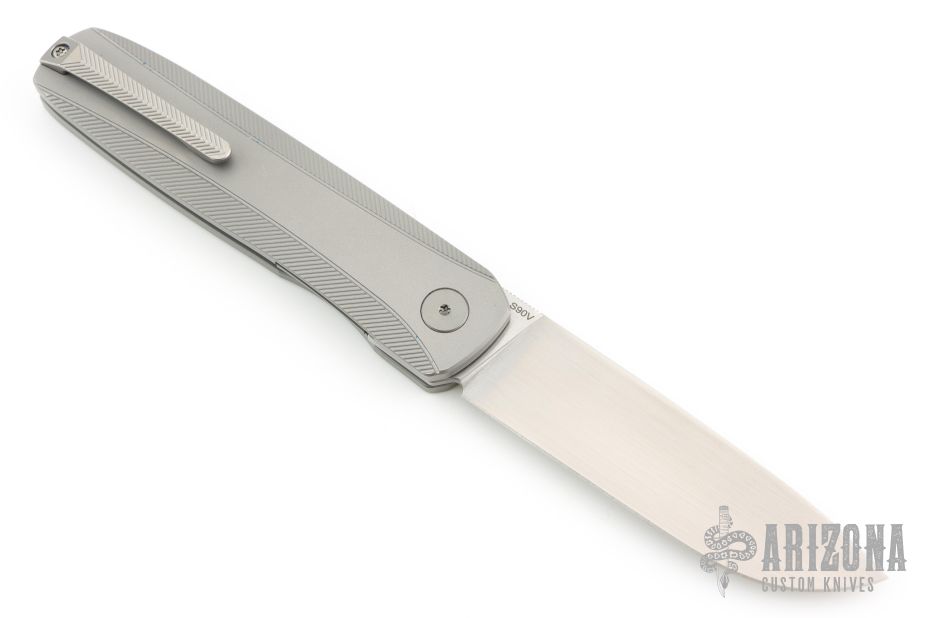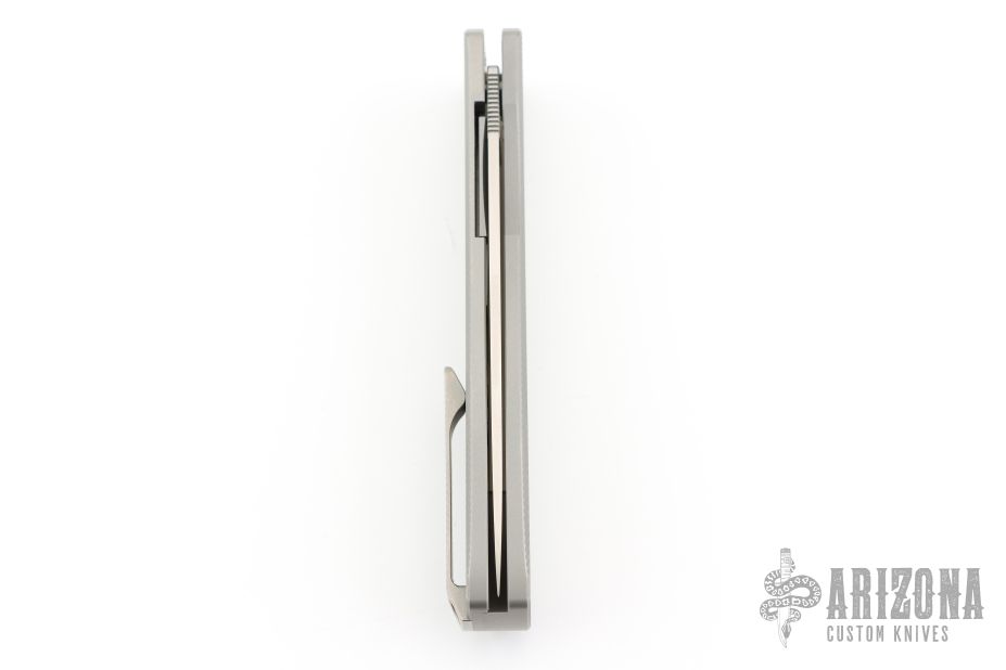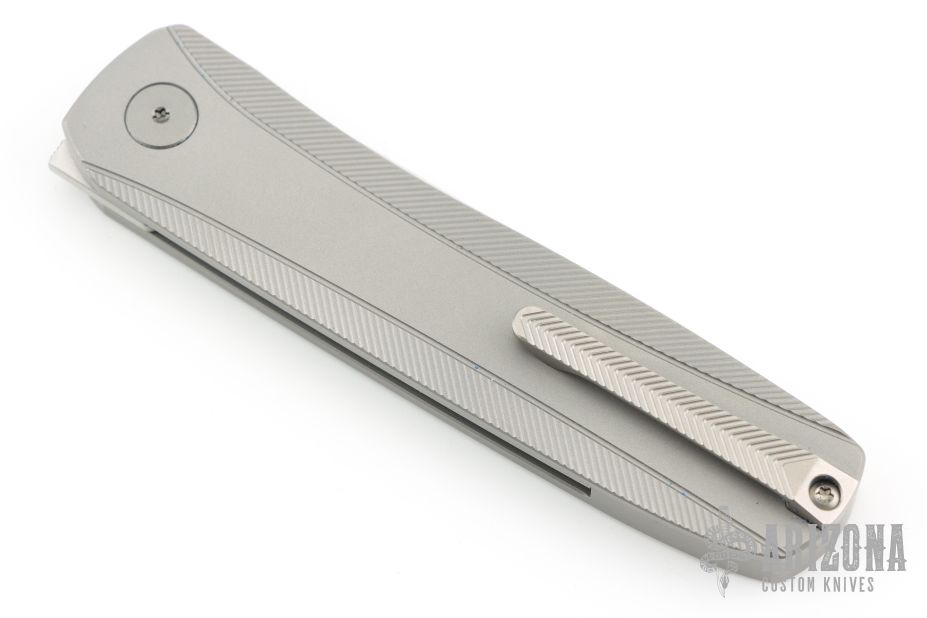 This knife features a satin finished drop point blade. The handle has bead blasted titanium frame with a matching milled tip up pocket clip. Includes the original box. Excellent Condition.