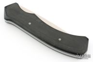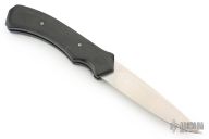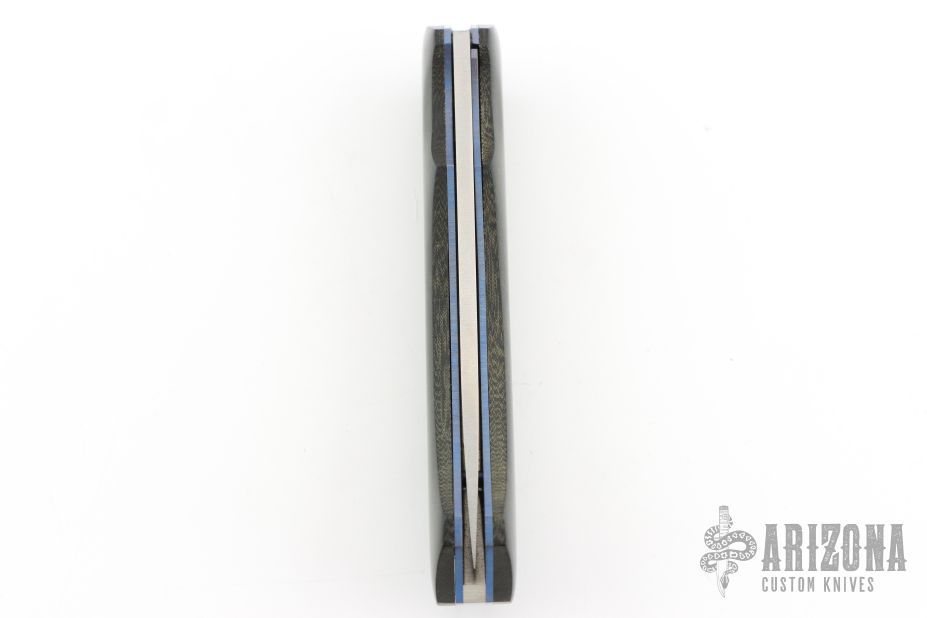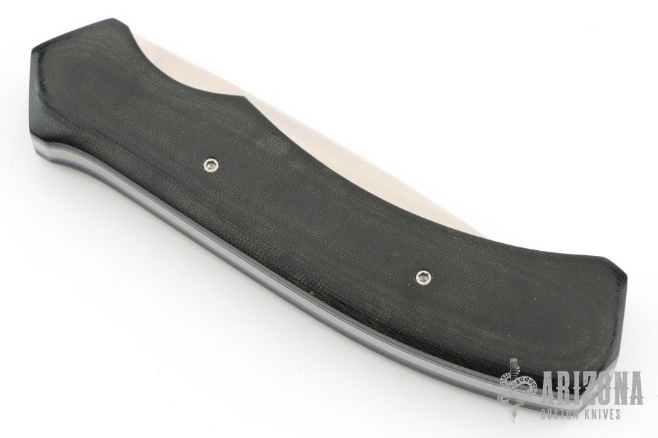 This left-handed Sidewinder II scale-release auto by Rainy Vallotton features a satin finished drop point blade. The handle has black linen micarta scales, anodized titanium liners, and stainless steel backspacer. #33. Nice action, lockup and blade seating. Comes with a zippered case. Has some light scuffs and scratches, great condition otherwise.
