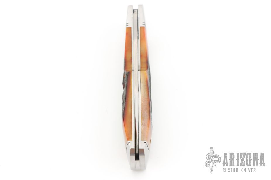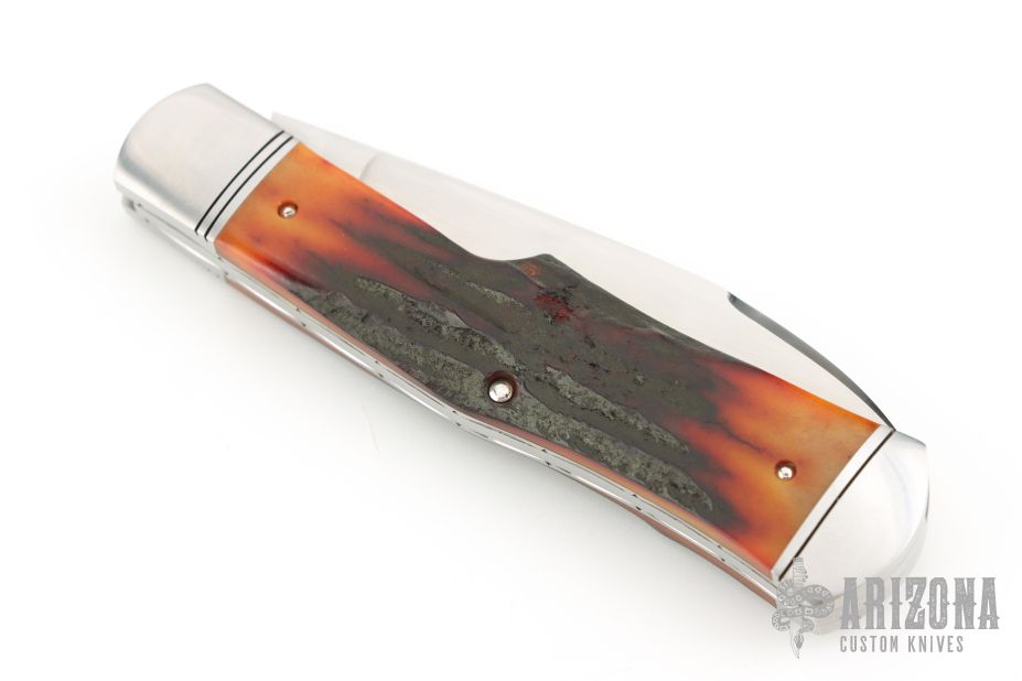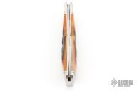 This Gunstock by Casey Berryhill features a hand rub satin finished blade with long pull nail nick. The handle has threaded satin finished stainless steel bolsters with integral liners, fileworked liner spines and jeweled interiors, stag covers, stainless steel escutcheon and spring. Has half-stop, flush in all positions. New from maker. Comes with zippered case and COA dated 7/6/25