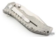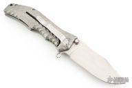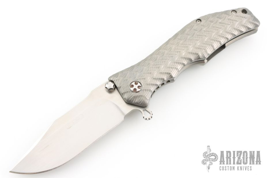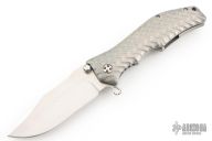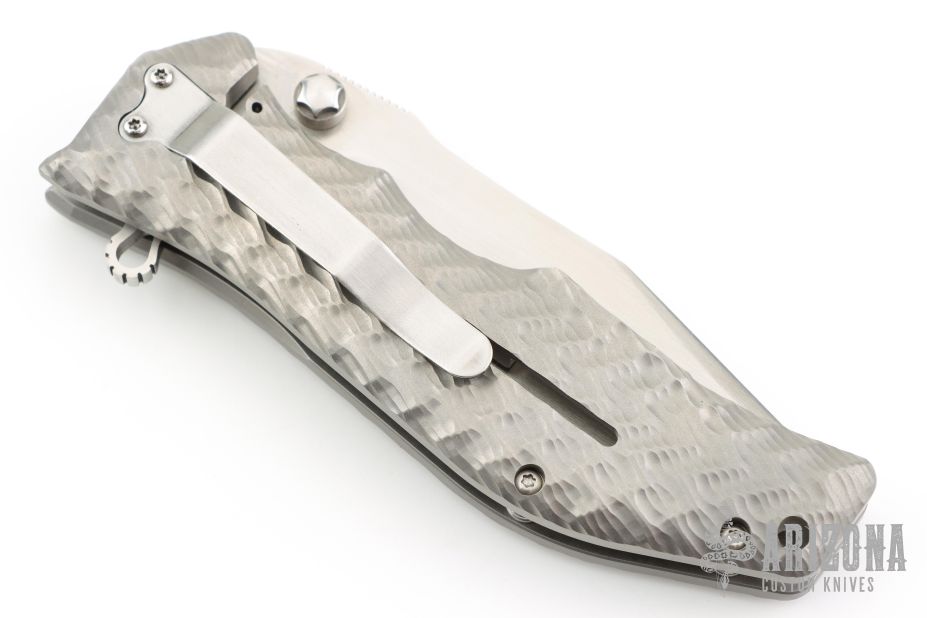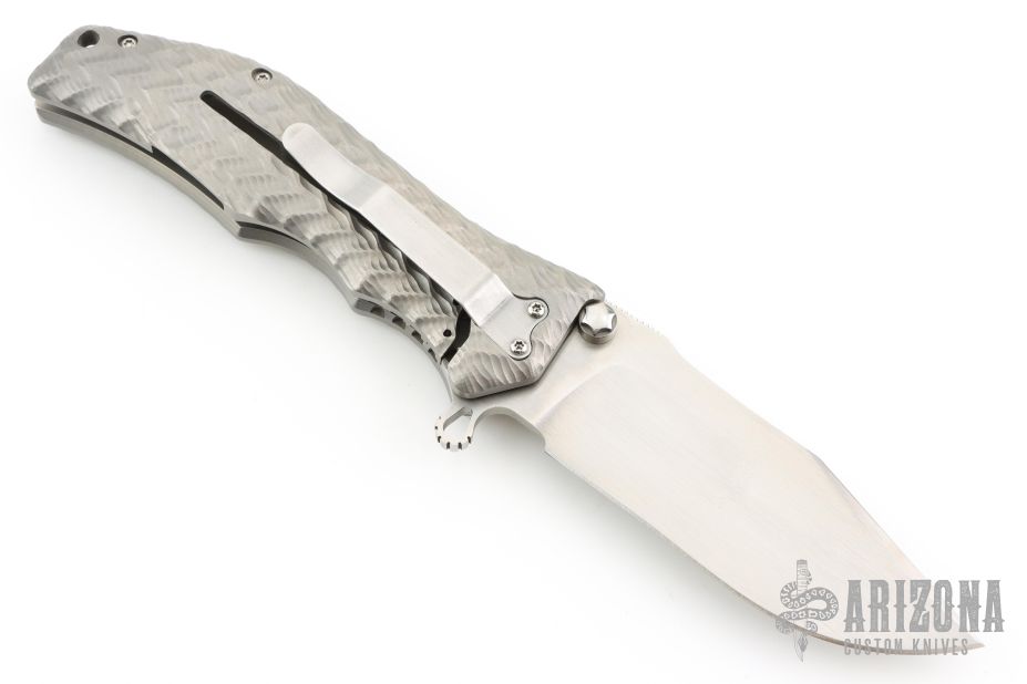 This Gunhammer Alpha assisted opening framelock by Darrel Ralph features a hand rub satin finished bowie blade with notched thumbrest, dual thumbstuds and a flipper. The handle has a 3D milled titanium frame and Darrel's SAO (Spring Assisted Open).  Stainless steel clip, tip down carry. Comes with makers zippered case. Nice detent, lockup and blade seating. Has a couple light scuffs and scratches, otherwise great condition.