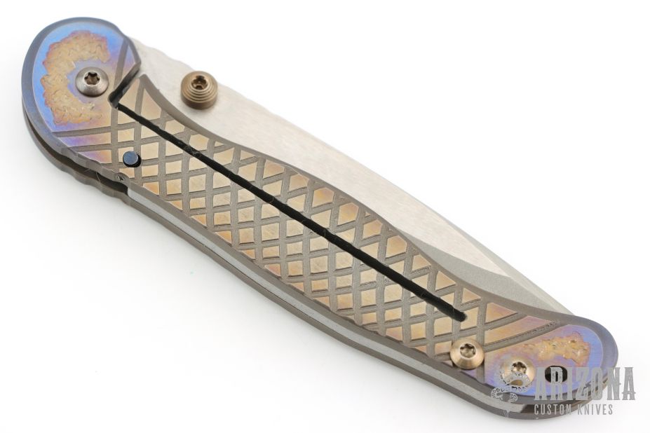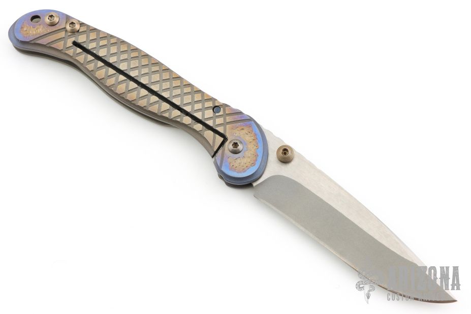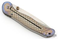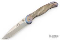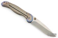 This Apogee D/A Auto by Darrel Ralph features a recurve two-tone blade with dual thumbstuds. The handle has a carved and anodized titanium frame with bronzed hardware and stainless steel spring. Nice action, detent, lockup and blade seating. Has a couple light scuffs and scratches, excellent condition otherwise.