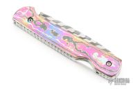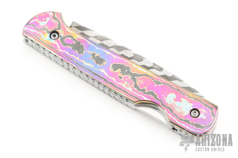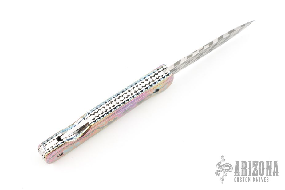 This lockback folder by EMA Forge features a Damascus blade. The handle has a Black Timascus frame with fileworked stainless steel liners and backspacer. Nice lockup and blade seating. Comes with a brown leather sheath, original box and papers. New from maker.