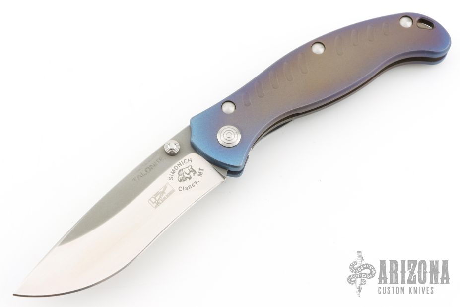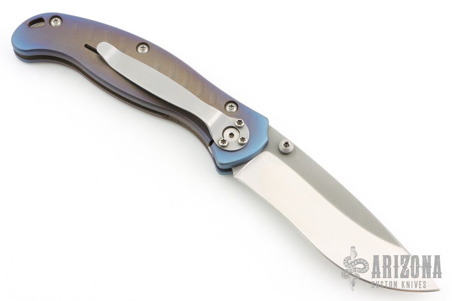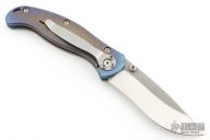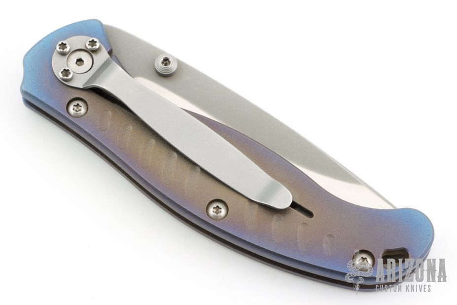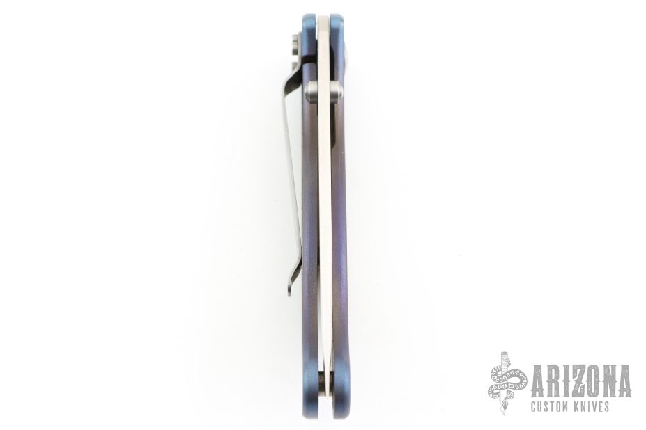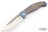 This knife by Darrel Ralph and Ralph Simonich features a two-tone recurve blade that is marked #2. The handle has an anodized titanium frame with a tip down bead blasted SS clip. Nice detent, lockup and blade seating. Comes with Bill's case. Has a couple light scuffs, excellent condition otherwise.