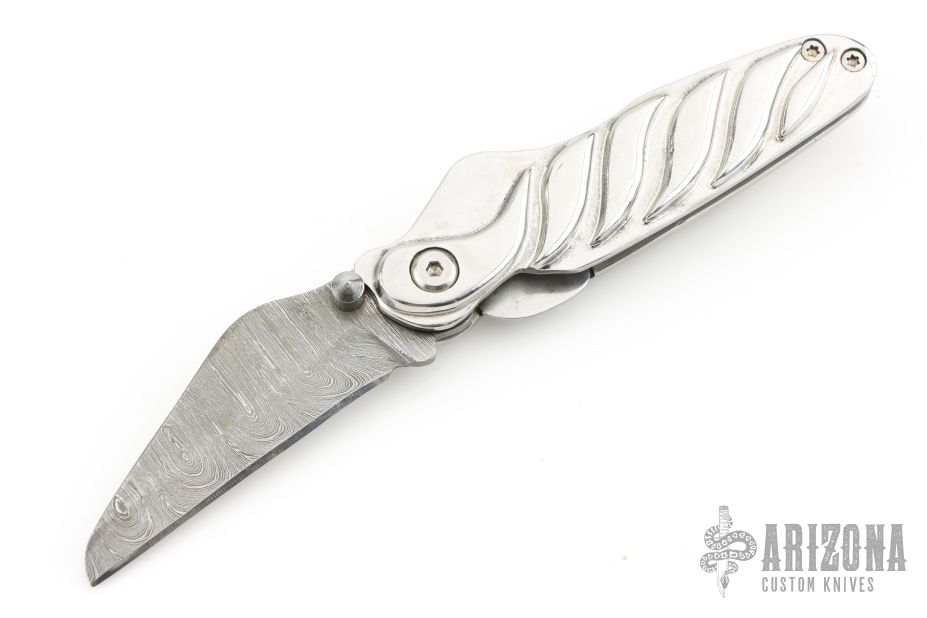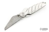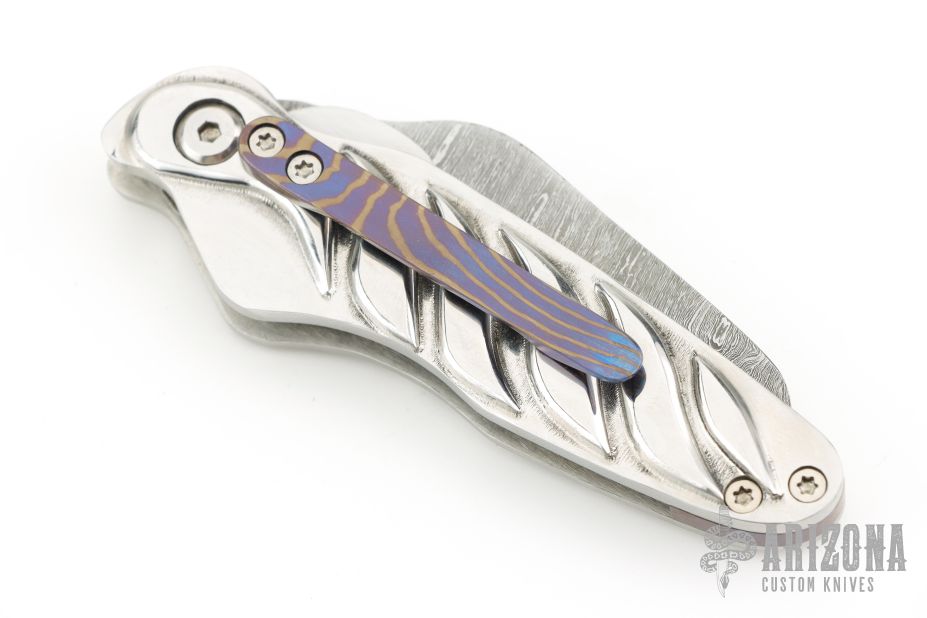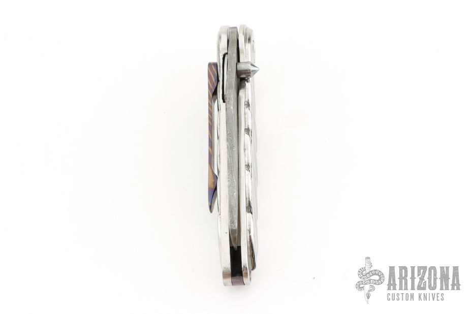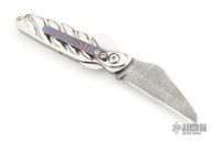 This linerlock by EMA Forge features a Damascus wharncliffe blade with single thumbstud. The handle has a milled stainless steel frame with timascus backspacer and tip down clip. Rides on bearings. Has a little lock rock. Comes with original box and papers. New from maker.