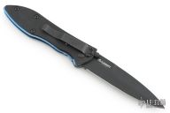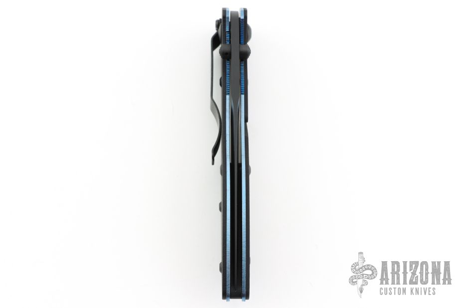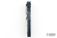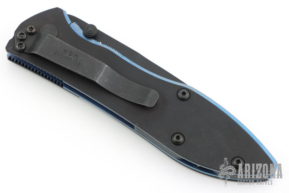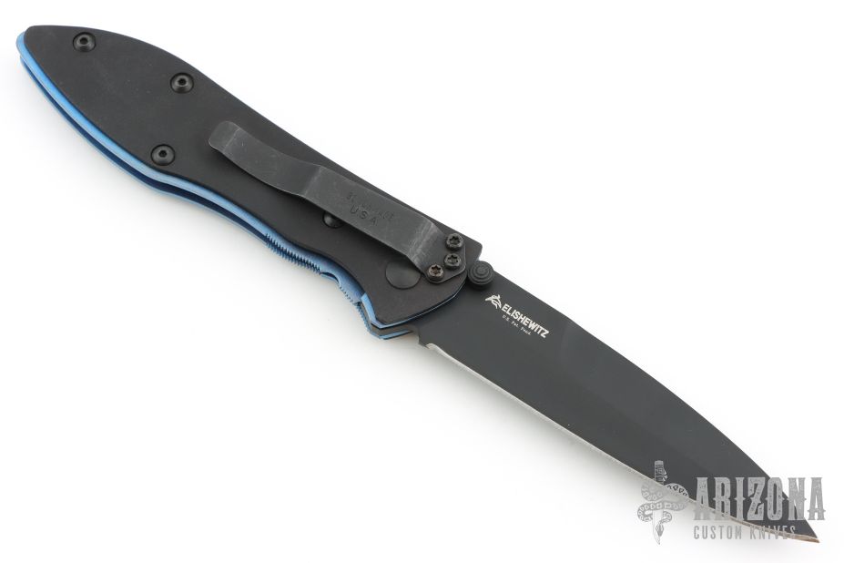 This 875BT Sentinel is an Allen Elishewitz design executed by Benchmade. It features a black coated spearpoint blade with swedge and dual thumb studs. The handle is comprised of a blue anodized titanium frame with black anodized aluminum overlays over a black polymer backspacer with recessed lanyard pin. The black coated steel pocket clip is positioned for tip down carry. Has some light scuffs and scratches, great condition otherwise.