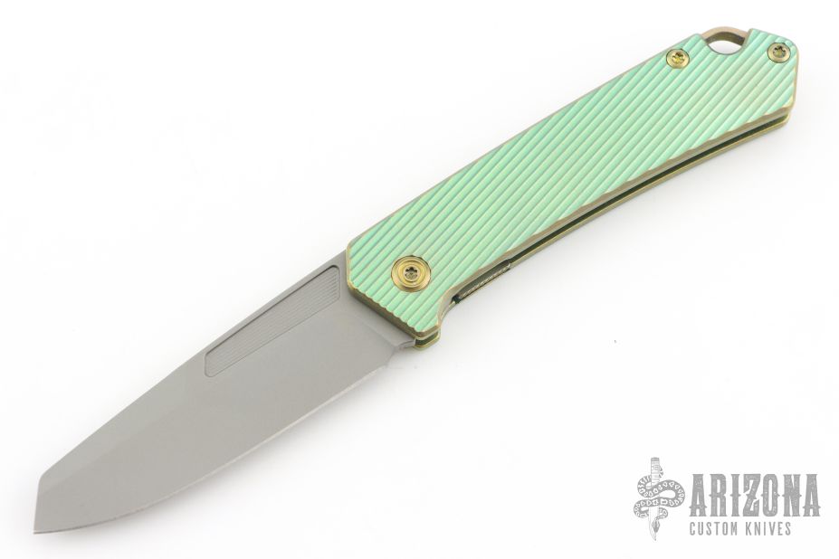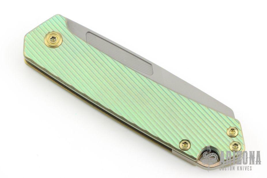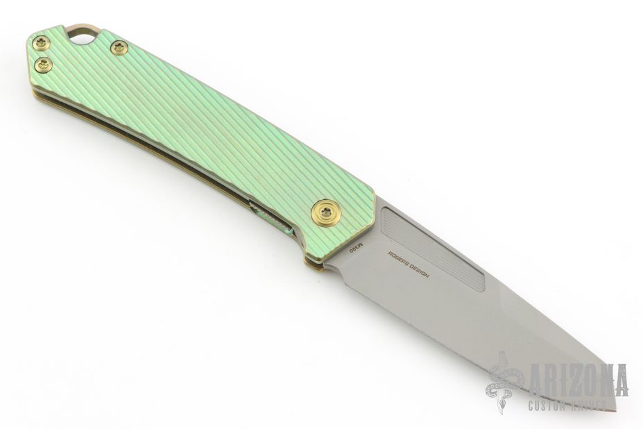 This OEM Slim is a Richard Rogers Design and features a bead blasted blade. The handle is milled and anodized titanium with blasted titanium backspacer, hardware and tip up clip. Nice detent, lockup and blade seating. Comes with original box and hardware. Has a couple light scuffs, excellent condition otherwise.