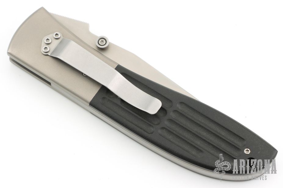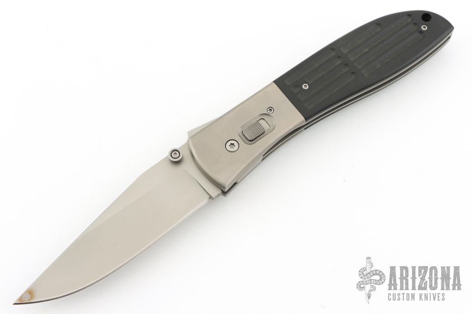 This large Model 4 automatic features a bead blast blade, titanium bolsters, and black G-10 scales. Stainless steel clip. 440C slide button. Notched thumb ramp. Numbered 02 on back of blade. Kit made this automatic in 1994-95, a total of 34 were made in various configurations. Strong and fast leaf-spring opening. Perfect function. Excellent fit and finish. Has a couple light scuffs and a stain on the blade. Excellent condition otherwise.