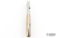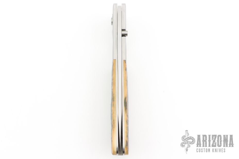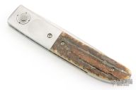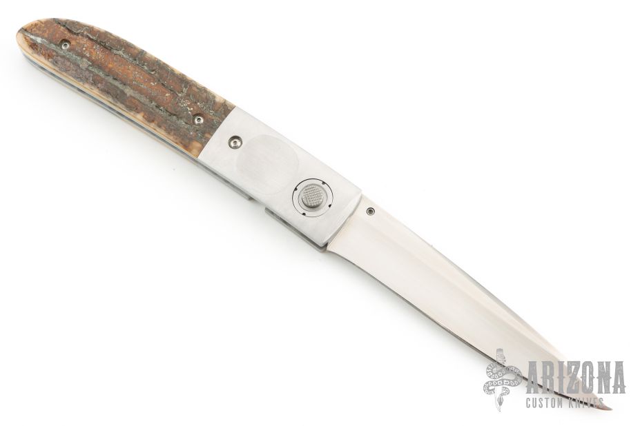 This button lock folder by Mel Pardue features a hand rub satin finished blade with single checkered thumbstud and false top edge. The handle has a satin stainless bolsters, mammoth ivory scales, stainless steel liners with jeweled interiors, stainless steel backspacer. Smooth action. Nice blade seating. The button to unlock the knife is in the pivot of the b-side bolster. Has some minor blade play, the blade rubs slightly, and has some very light scratches, otherwise excellent condition.
