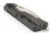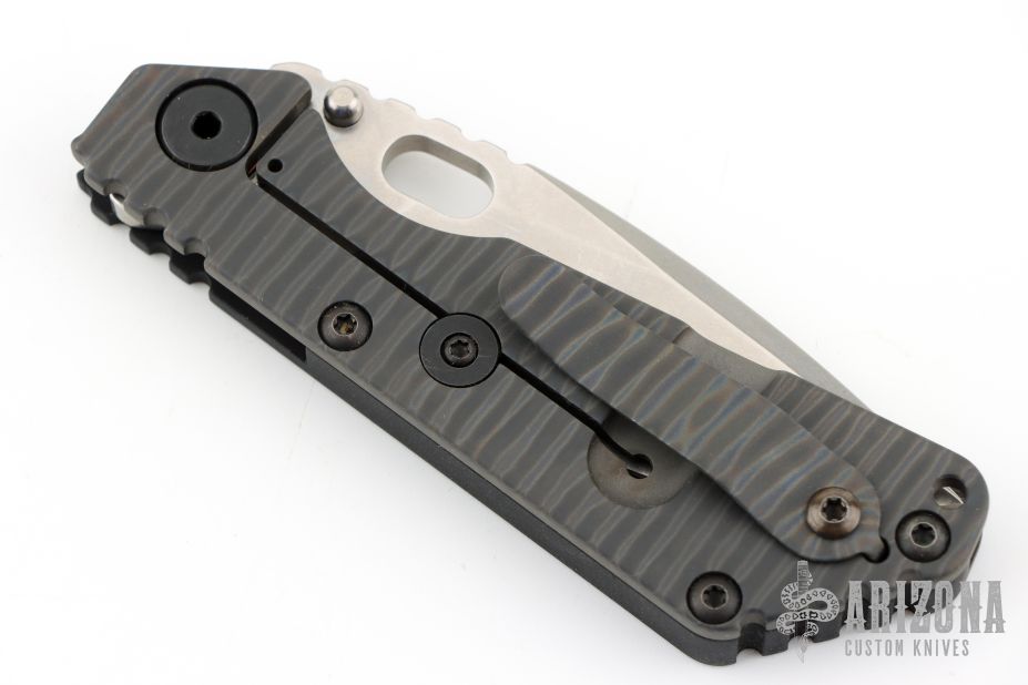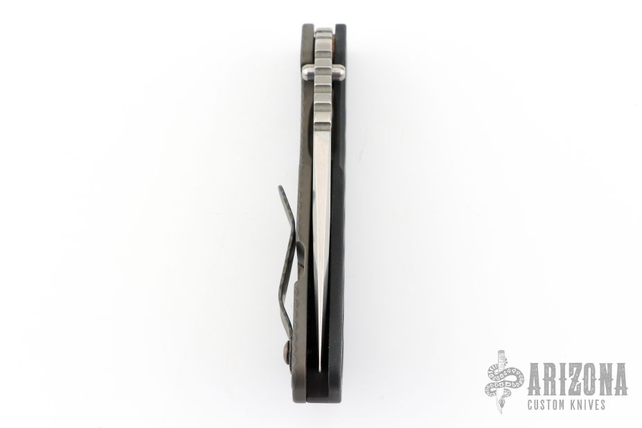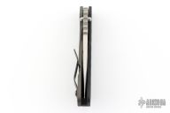 This SNG framelock folder by Mick Strider features a drop point blade and a black aluminum and flamed titanium frame and tip up titanium clip. Includes Hinderer "Lock Bar Stabilizer" for maximum reverse lock retention. Nice detent, lockup and blade seating. Excellent condition.