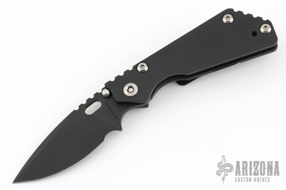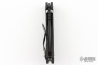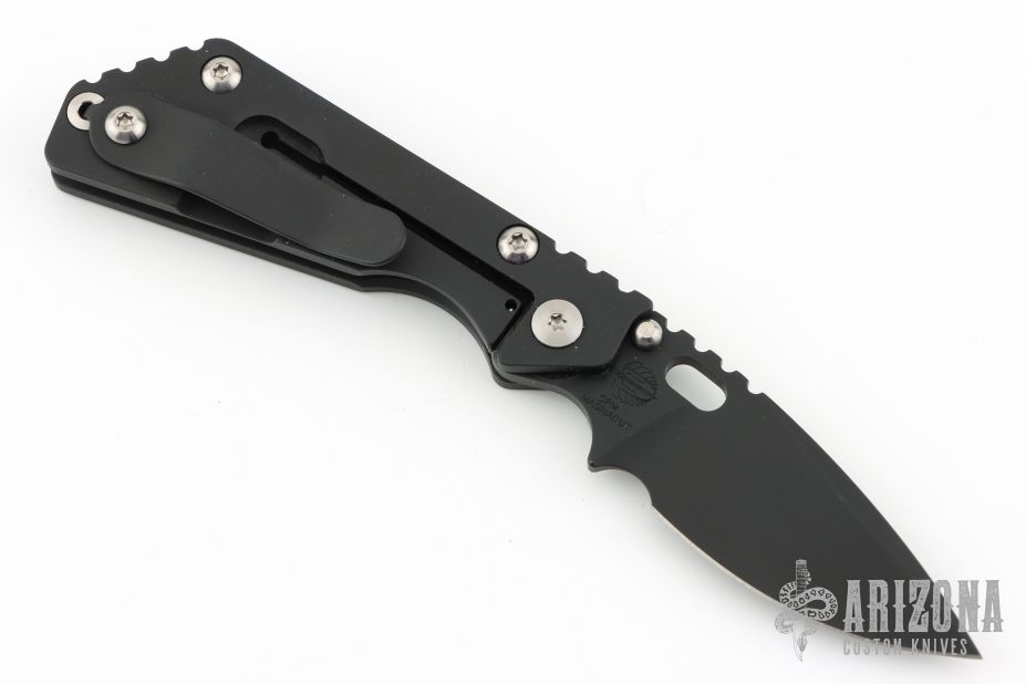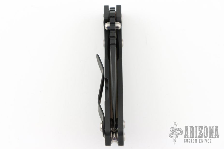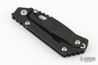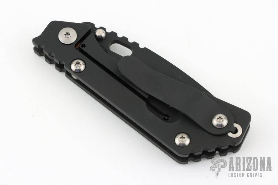 This PT by Mick Strider features a black blade with notched thumbrest and thumbhole. The handle has a black titanium frame with matching tip up clip. Excellent condition.