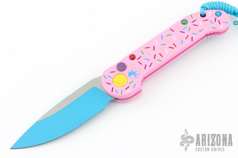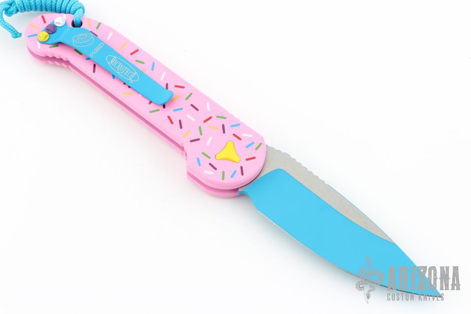 This LUDT by Microtech features a two-tone coated blade with fullers. The handle has a Dessert Warrior coated aluminum frame with multicolor hardware and tip up clip. Dated 01/2023. Comes with original box and papers. Excellent condition.
