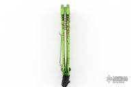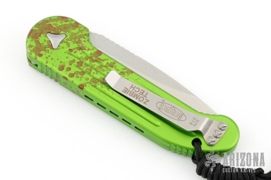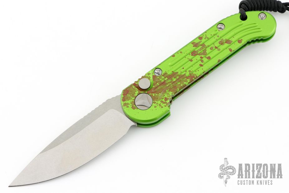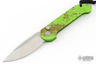 This LUDT side opening automatic by Microtech has a stonewash finished blade with a standard edge and a contoured green aluminum frame. Stainless steel clip. Serial number 078. Comes with original box and papers. Excellent condition.
