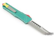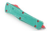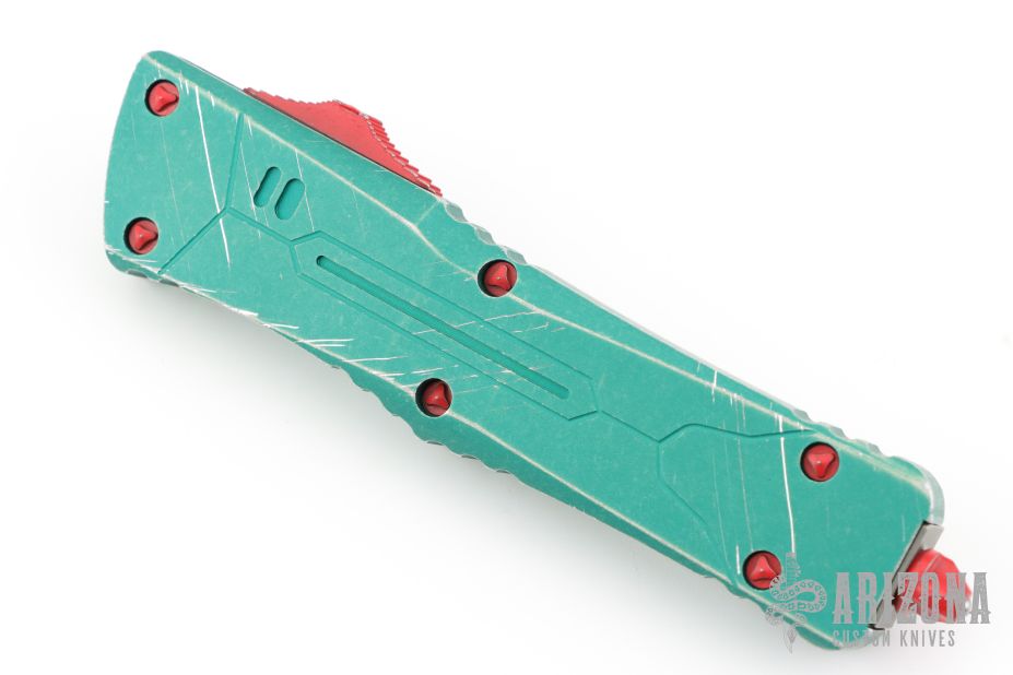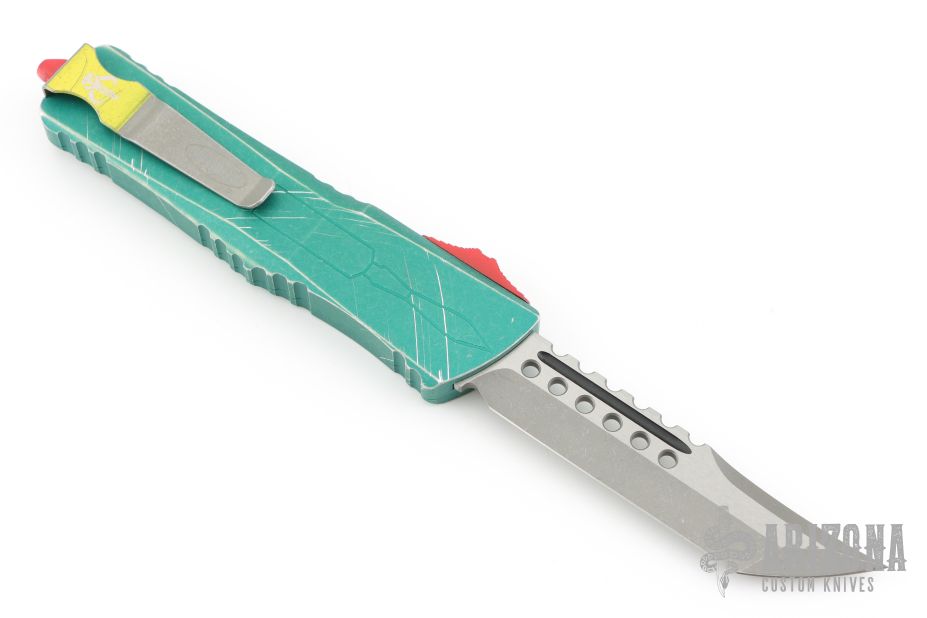 This Combat Troodon Bounty Hunter by Microtech Knives features a Hellhound tanto blade with fullers, satin flats and apocalyptic finished grinds. The handle has a green battle worn aluminum handle with red hardware, tip down apocalyptic finished stainless steel clip.  Includes the original box and papers. Excellent condition. Dated 06/2023 s/n 3247.
