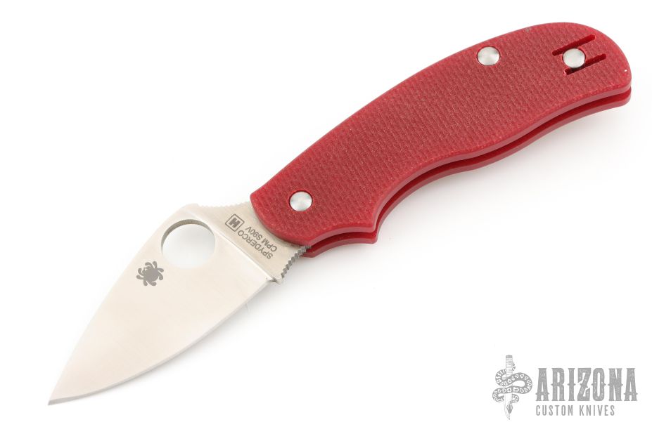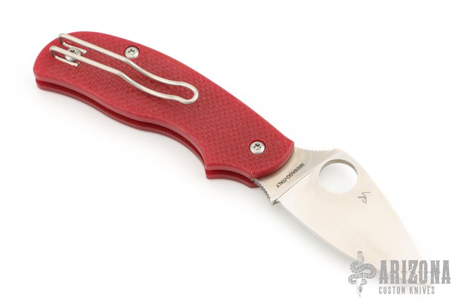 This Urban knife by Spyderco features a satin finished blade with thumbhole and notched thumbrest. The handle has red G-10 scales with a reversible tip up clip. New condition. Comes with original box and papers.