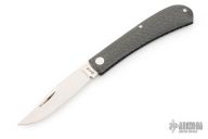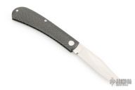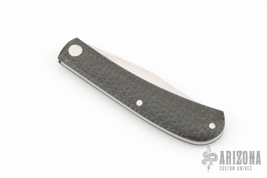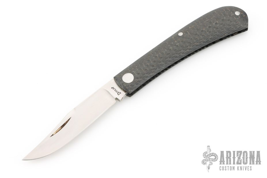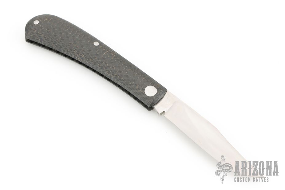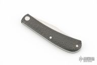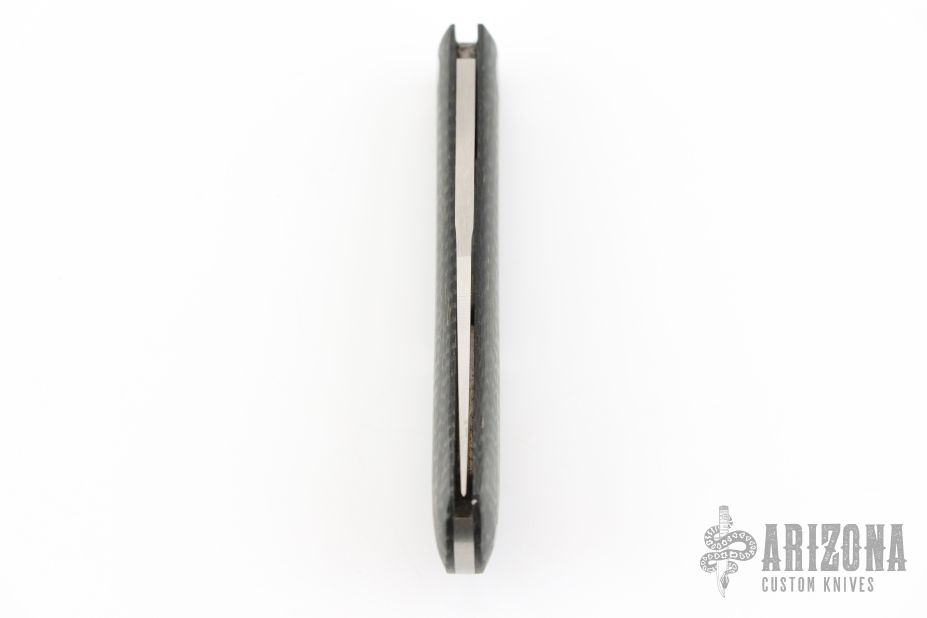 This Shadow Trapper by Jim Dunlap features a hand rub satin finished clip point blade with nail nick. The handle has lightning strike carbon fiber covers and a stainless steel spring. Has a half-stop, flush in all positions. Has a couple light scuffs/scratches and is a little dirty, otherwise great condition.