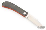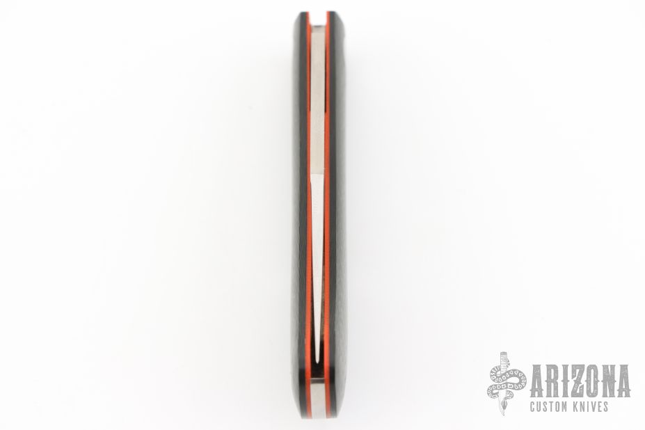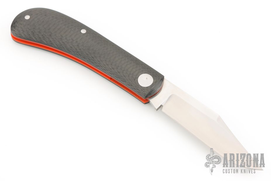 This Lanny's Clip by Jim Dunlap features a hand rub satin finished blade with long pull. The handle has pinched carbon fiber covers, orange liners and stainless spring. Has half-stop, and is flush in all positions. Includes padded zippered case. Has a couple light scuffs, otherwise Excellent condition.