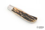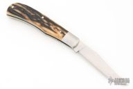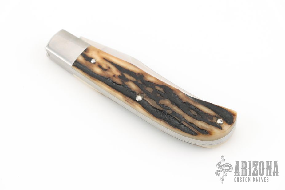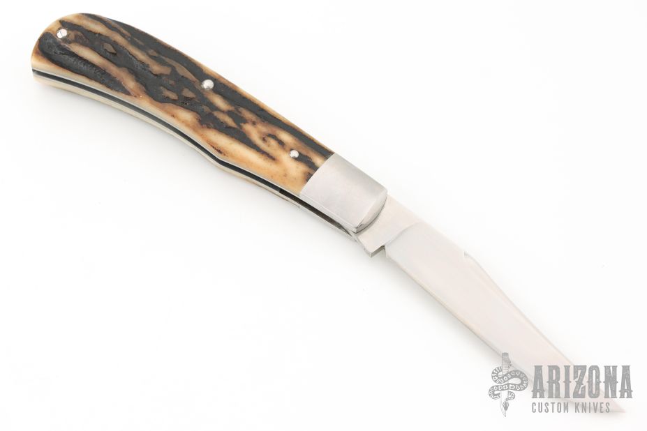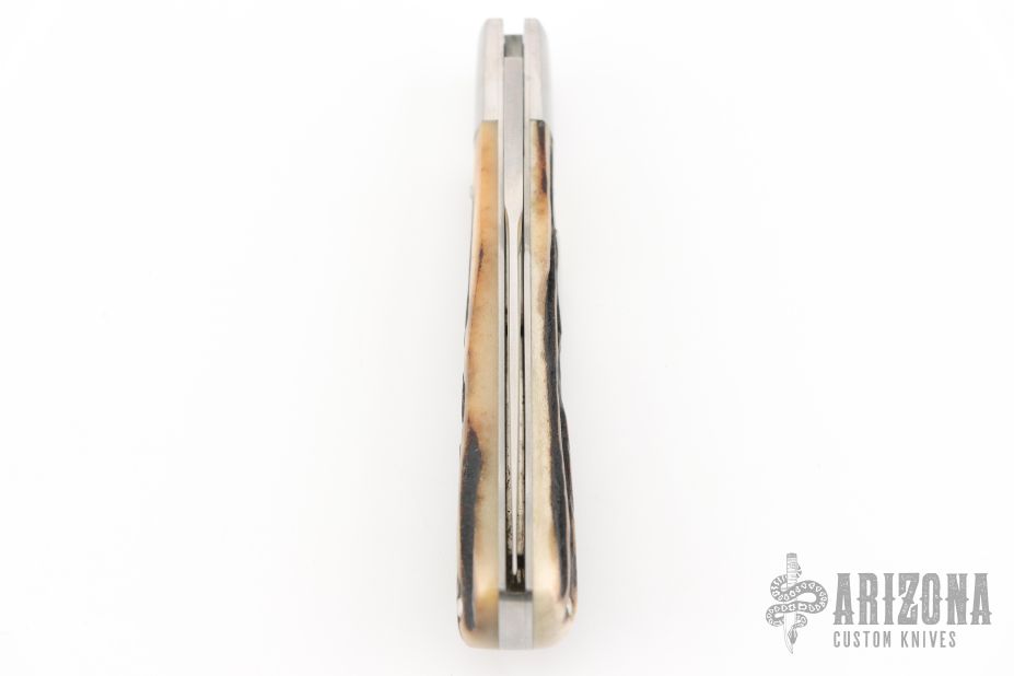 This knife by Mike Zscherny features a hand rubbed satin finish and nail nick. The handle has pinched stainless bolsters, stag covers, stainless steel spring, liners, and escutcheon. Half stop on blade, flush in all positions. Comes in a zipper case. Has some light scratches, great condition otherwise.
